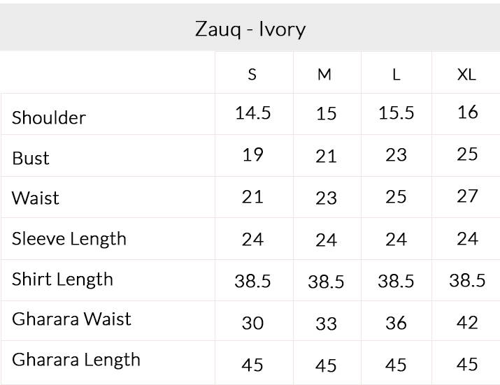 Zauq, An ivory cambric printed shirt, beautifully finished with refined trims and an elegant border, enhanced with delicate adda work for a handcrafted touch. It is paired with a flowing chiffon gharara, detailed with graceful trims that add movement and charm. The ensemble is completed with a single chaan dupatta, lending a subtle festive glow to this timeless and sophisticated look.