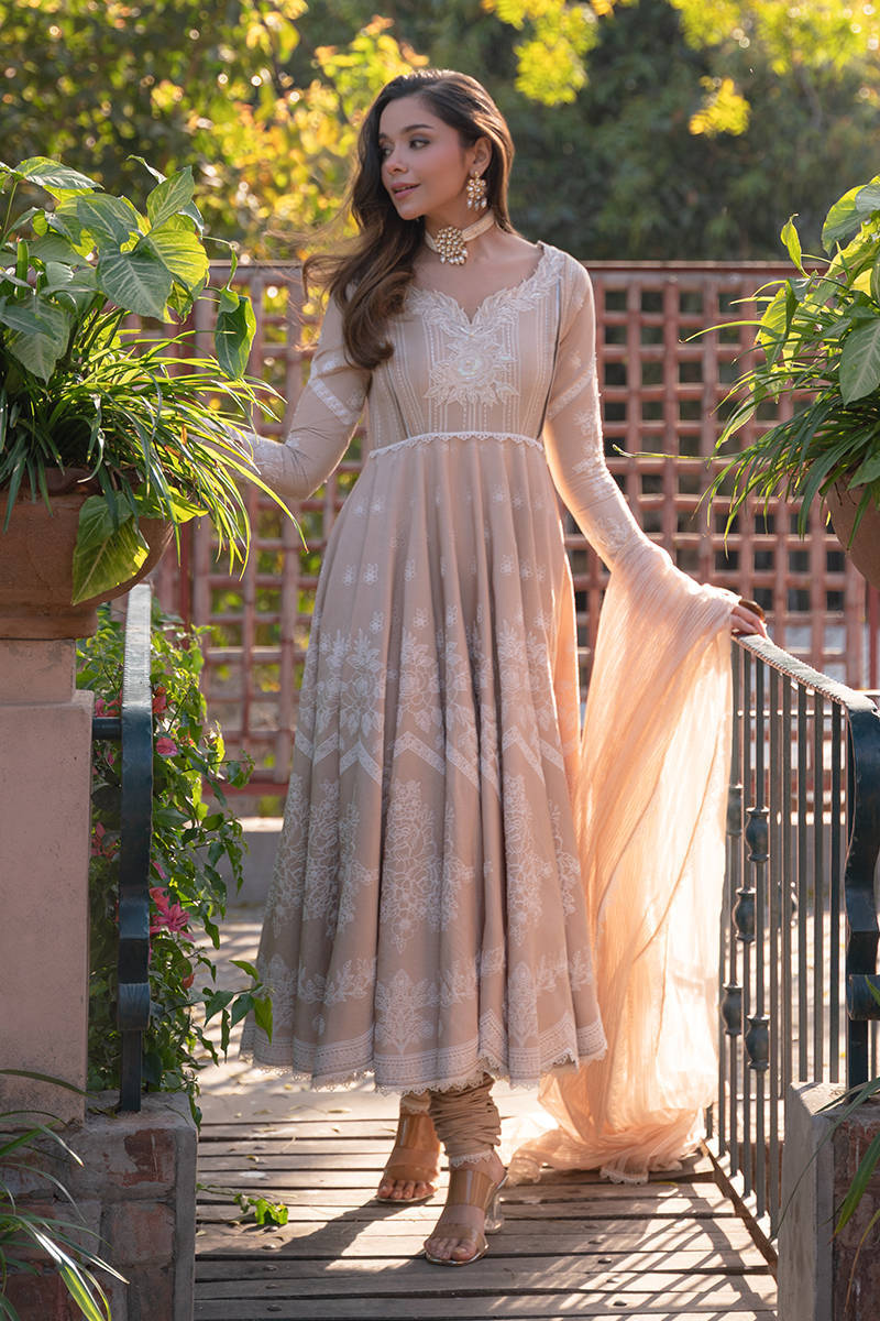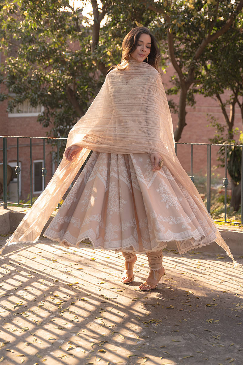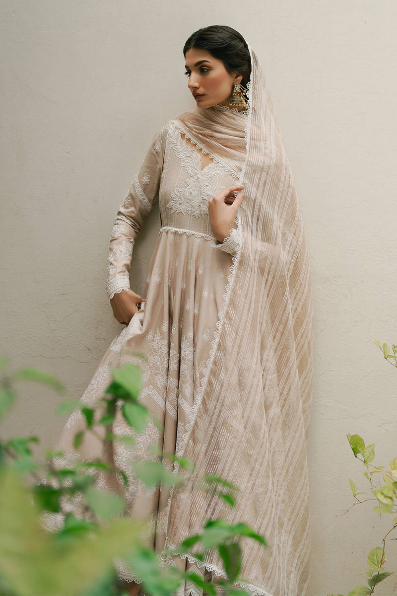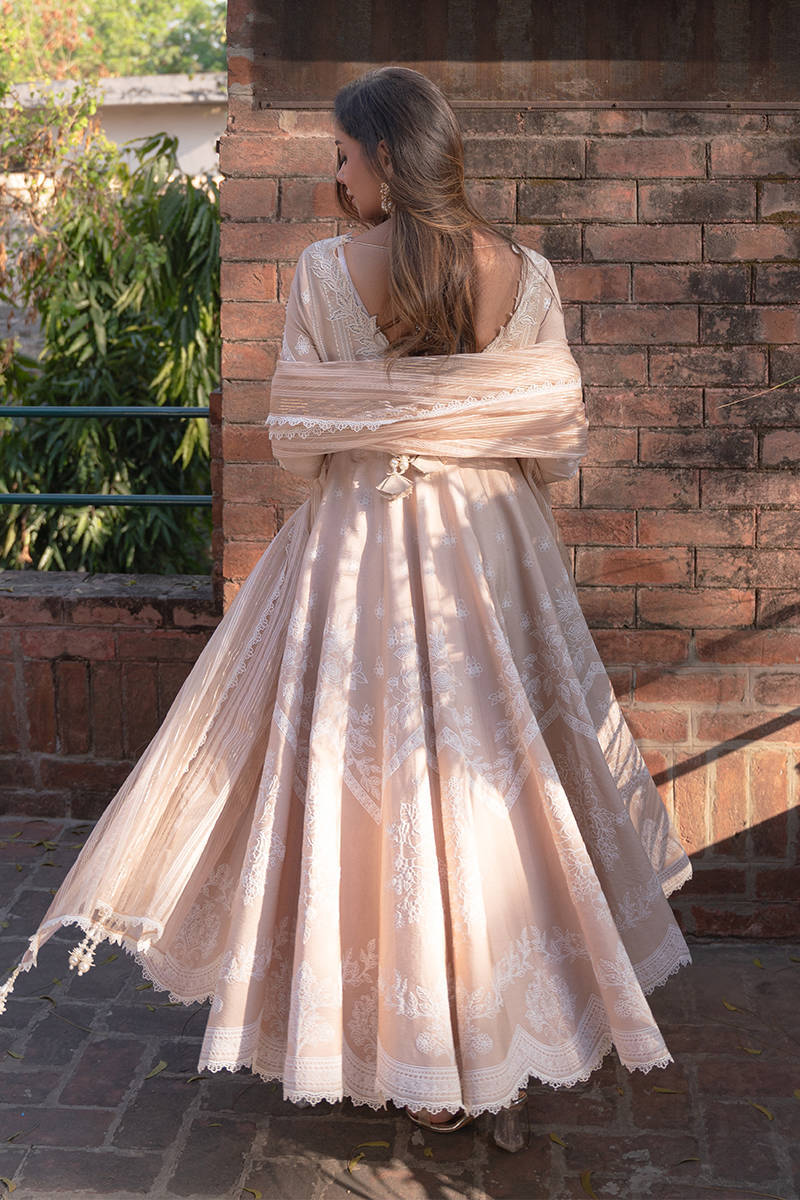 A cotton net peshwas in a warm biscuit-white hue, featuring an embroidered neckline accented with lace-like leafy appliqué, soft pleats, and embellishments. The sleeves and skirt are adorned with puffed screen prints of rose bouquets, finished with crisp white cotton trims. A textured tilla organza dupatta, bordered with white trims, completes this elegant ensemble. A timeless choice for Eid prayers and daytime festivities.