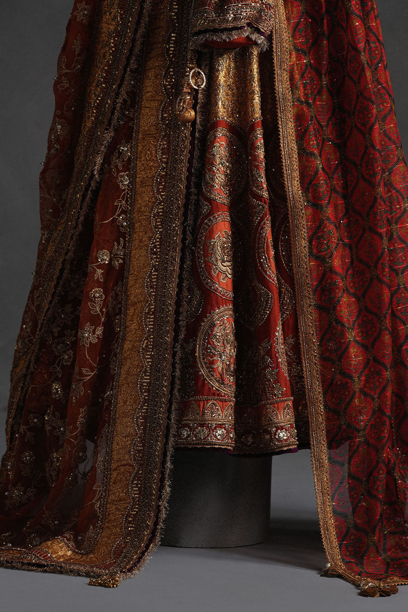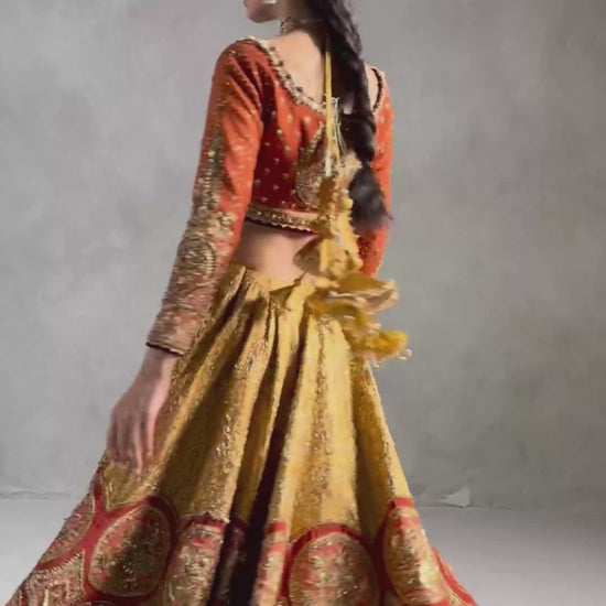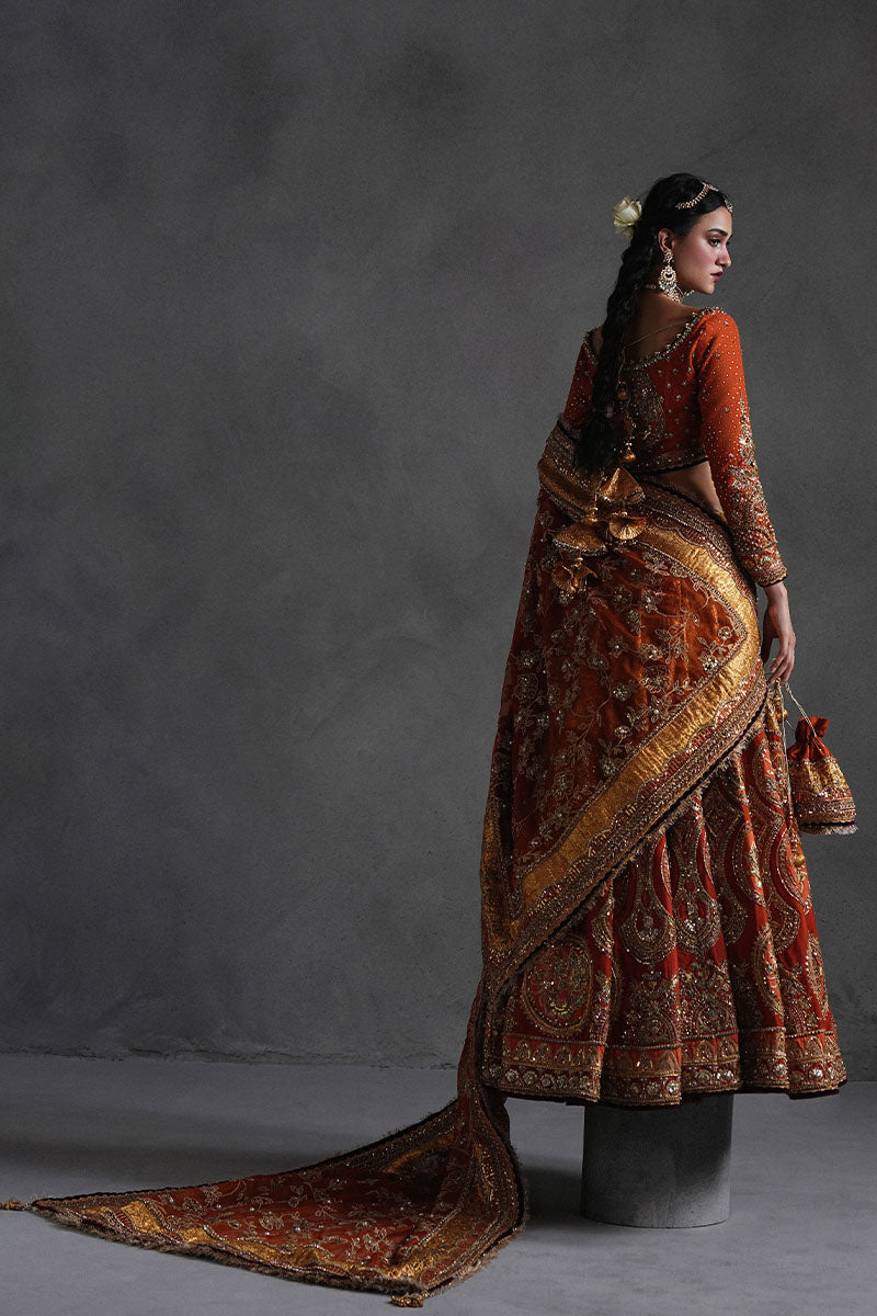 Bano begum Is a marigold orange ensemble it is a dazzling ode to celebratory grandeur. The Italian silk choli glows with golden trims, heavy adda work, and a dusting of sequins, while the jamawar lehenga is mapped with roundels enclosing floral emblems, painstakingly embroidered across its breadth. Two dupattas offer layered drama, one richly worked organza with four-sided jamawar borders and gold embellishments, the other feather-light and printed, offering a breezy counterpoint. A bejeweled pouch, dripping with sequins, trims, and beadwork, completes this look