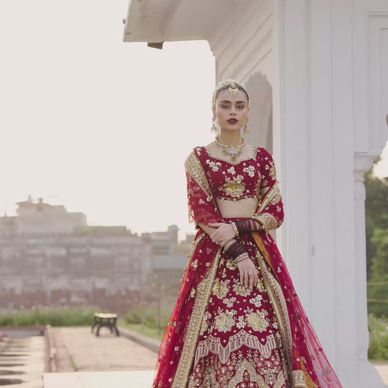 A stunning red lehnga choli meticulously adorned with shimmering sequin work and intricate adda embroidery, exuding timeless charm and grandeur. The look is complemented with an ethereal organza dupatta, delicately embellished with chan sequins and a beautifully finished border, creating a perfect harmony of tradition and elegance.