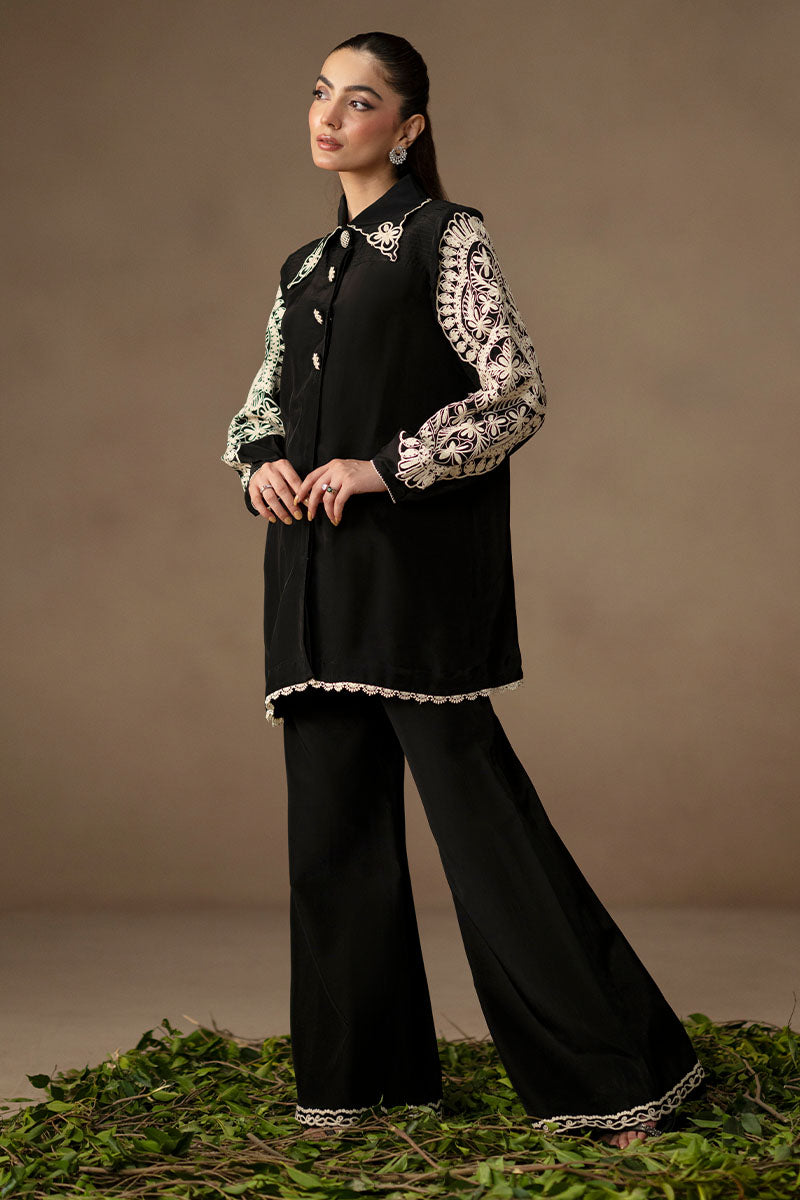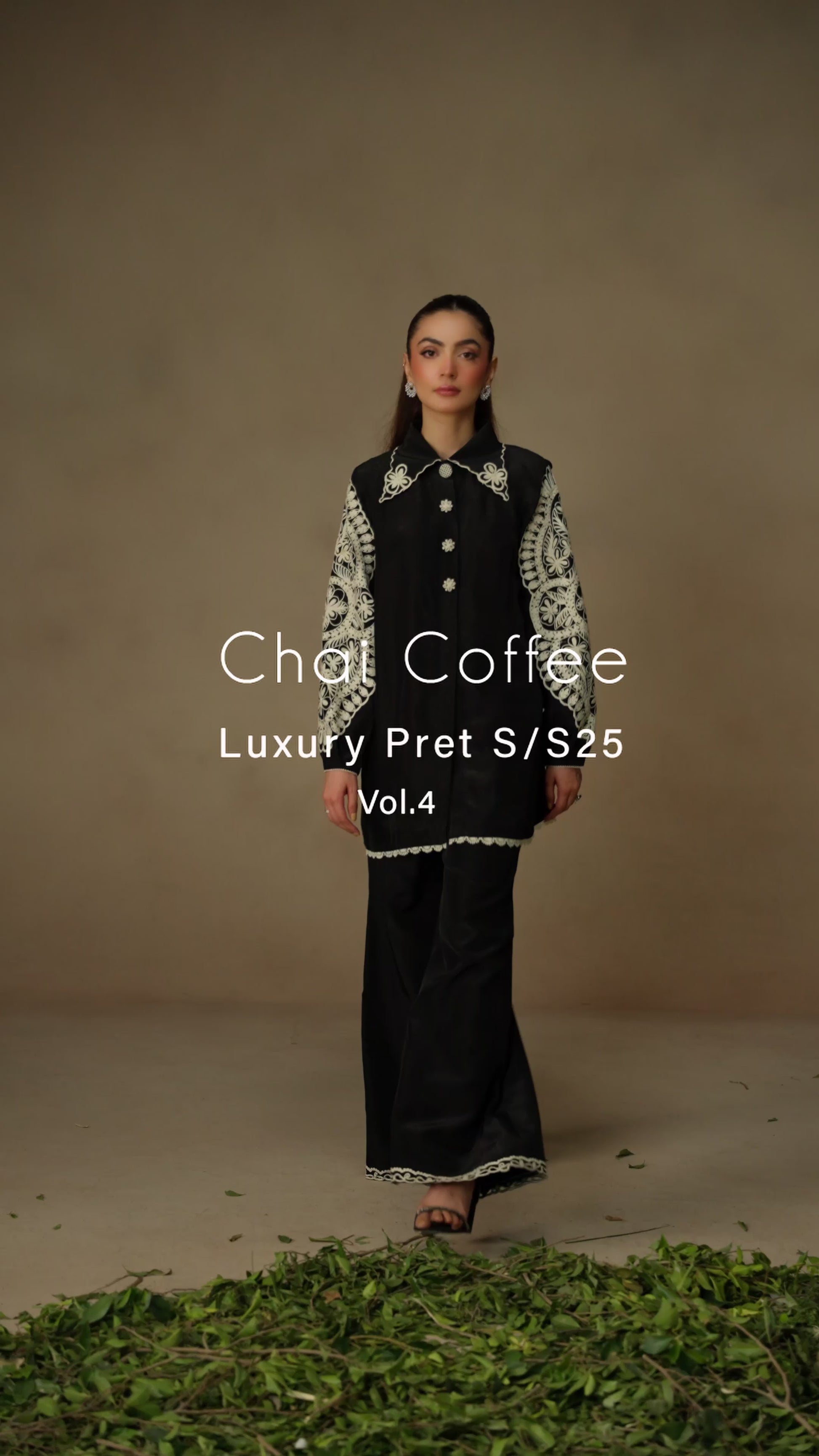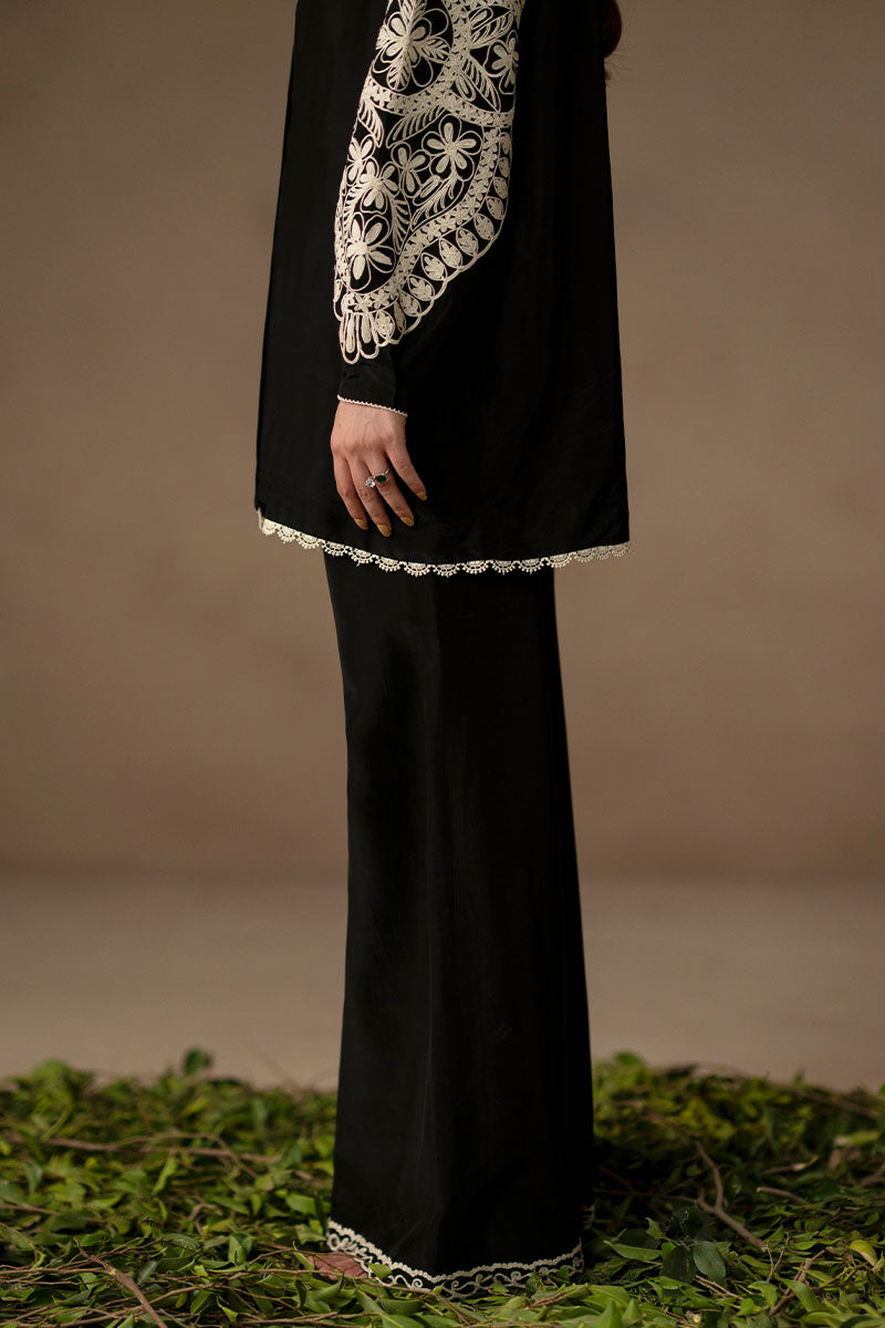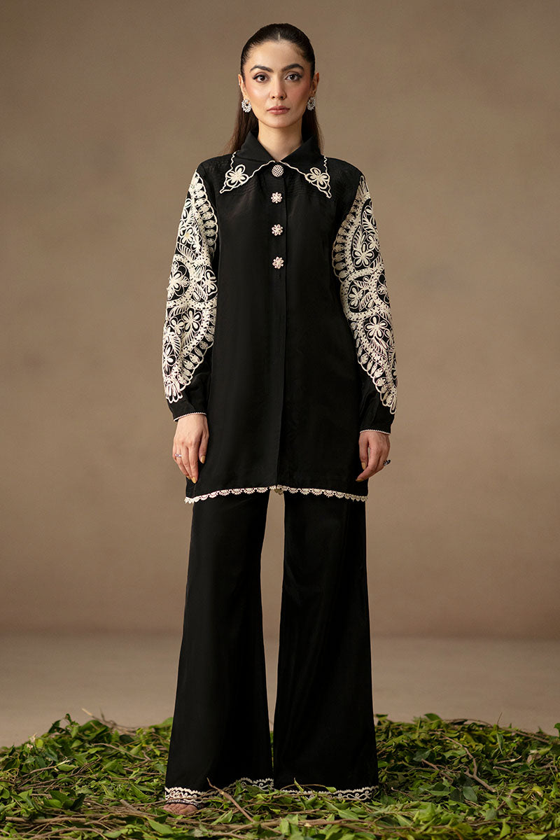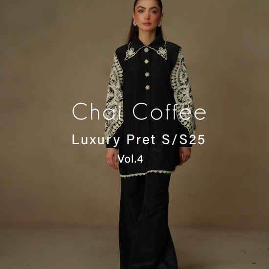 Because black is never just black. There’s elegance, and then there’s elegance in black. The Cinder ensemble leans confidently into the latter, with a long-sleeved shirt that centers a bold collar and Kashmiri-style floral embroidery in soft beige. The buttons bold, and expressive line the front with purpose, while ornate edging frames the hem. Matching wide-legged trousers carry a faint embroidery echo, tying the look together with discipline. For the night that starts with a message: Chalo, let’s meet somewhere.
