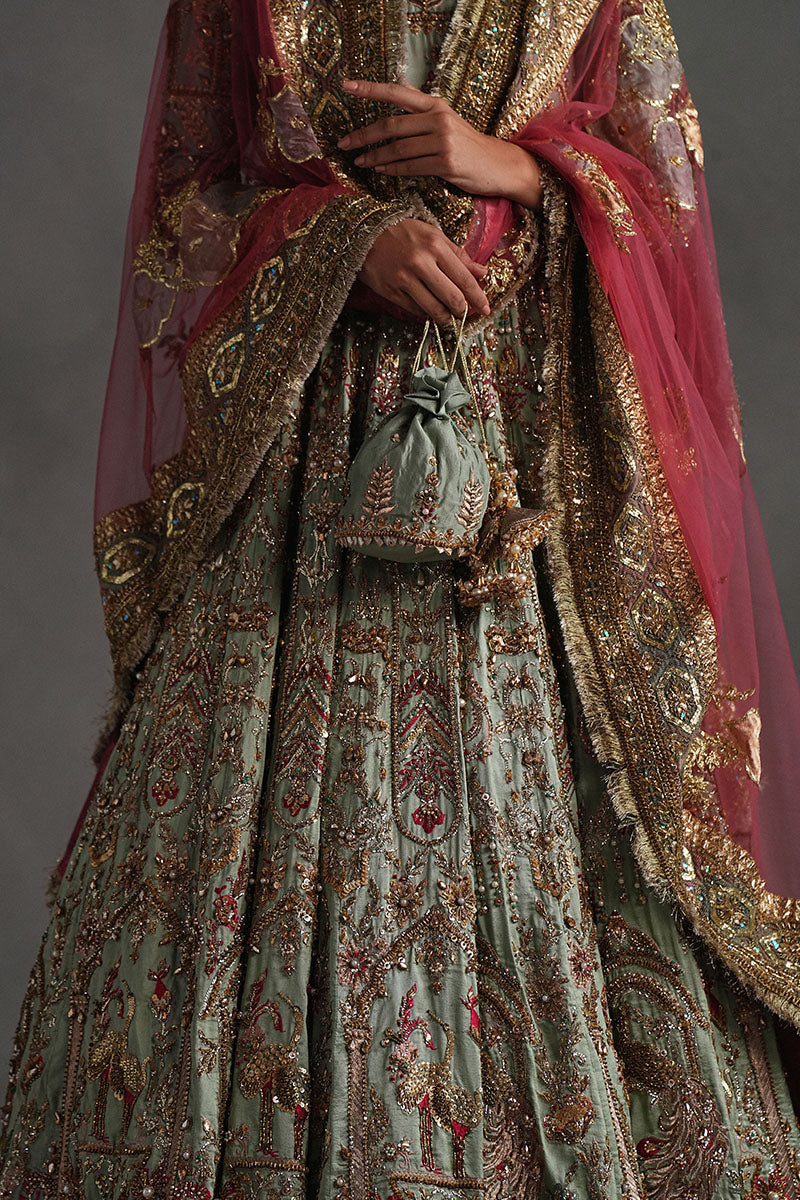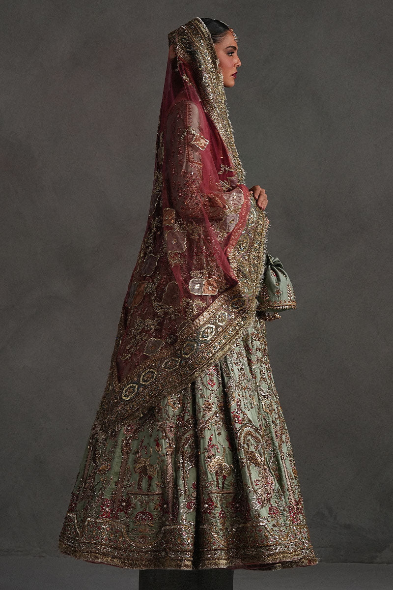 Geeta is sage green and coral red ensemble. The pishwas cascades into a flare alive with Mughal niches, garlands, and peacocks, all wrought in metallic thread embroidery , sequins, and fluttering hand embellishments. The coral-pink dupatta offers a romantic contrast, bordered with broad embroidery, glinting sequins, and kiran trims that dance as you move. Appliqué work and glistening hand details throughout make this piece feel like a living, breathing miniature painting.