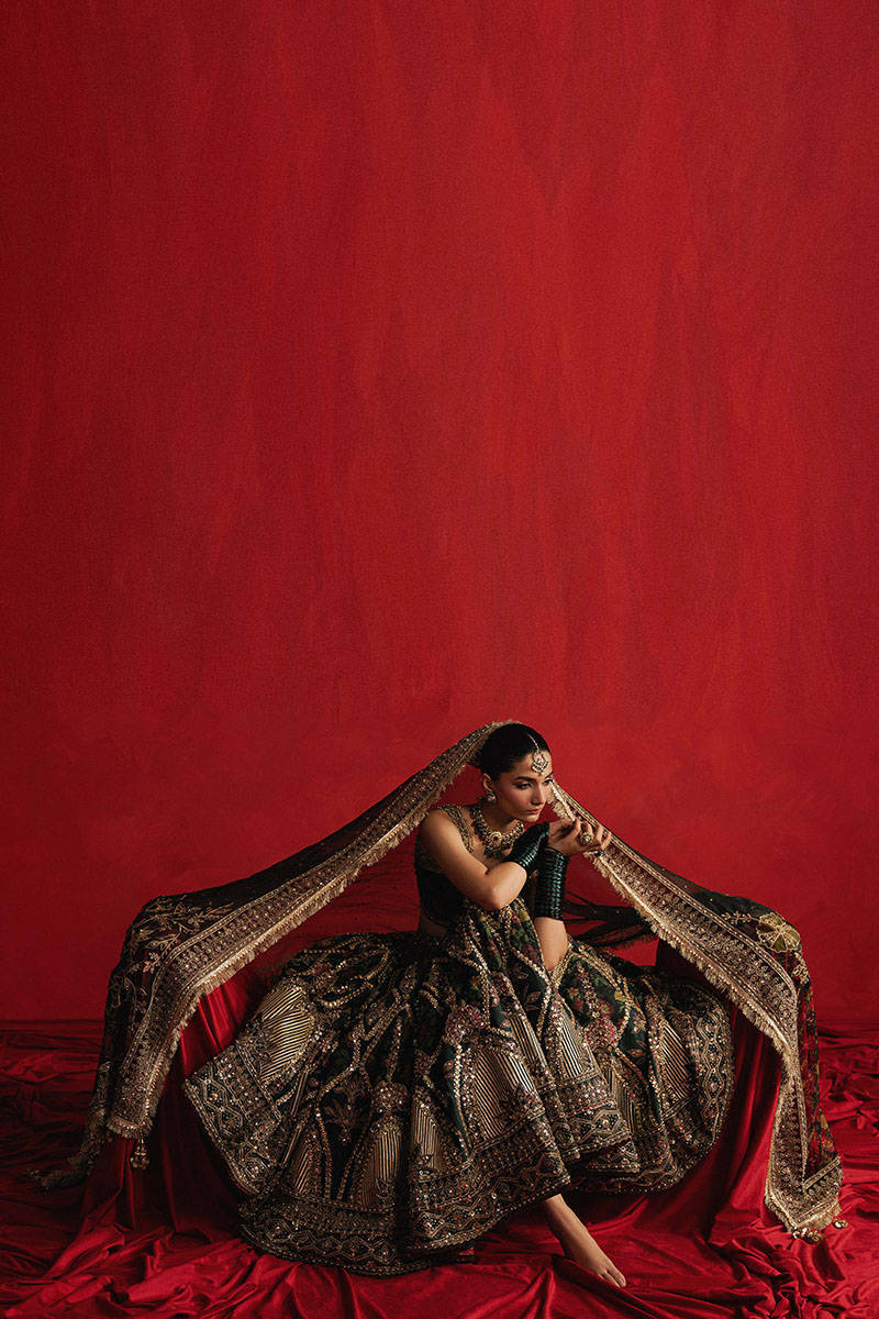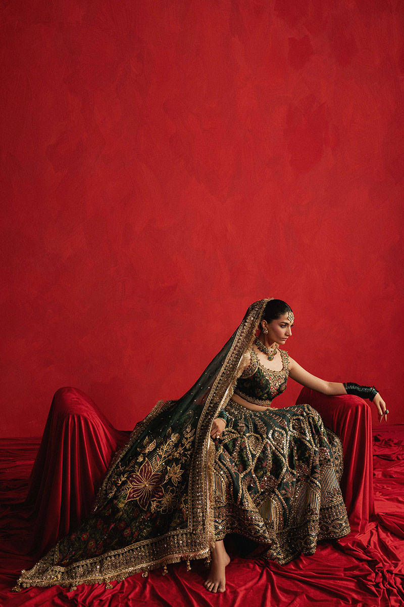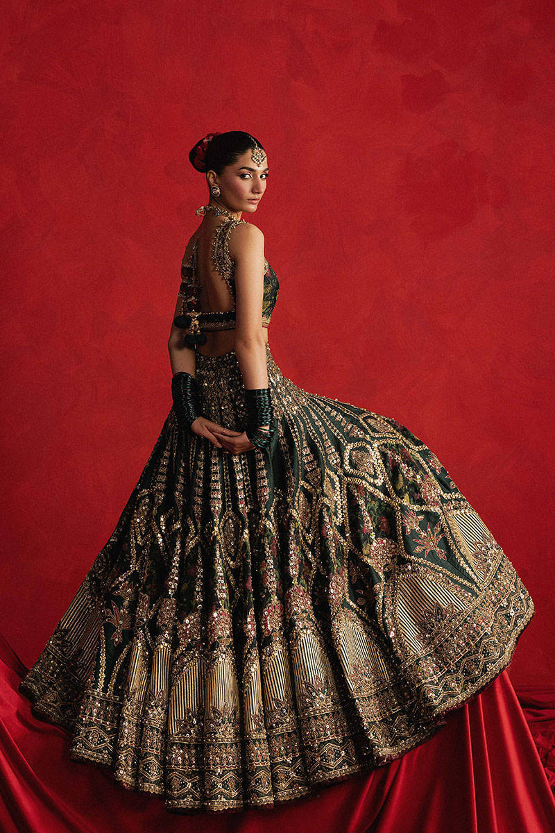 Gul-e-Khaas is something rare done in dark green Indian silk ensemble, bold and botanical, starts with a sleeveless choli in floral printed silk, traced with golden embroidery across the neckline and straps like delicate vines creeping along marble. The lehenga spills open like a secret Mughal garden, featuring appliqués of the same floral print, layered over block-printed motifs and enhanced with gota patti, mirror work, and fine hand embroidery. The spade-like motifs cascade downward and transform into intricate geometric patterns inspired by Mughal ceiling art symmetrical, hypnotic, and rich in detail. Lines of sequins and mirrorwork slash through the skirt like glints of sun in foliage. The hemline is a spectacle unto itself, with an ornate Mughal border densely embroidered in golden threadwork. The matching organza dupatta is no less opulent, blooming with large and small printed flowers at both ends, accented with gota patti and adda work, framed by embroidered borders and finished with charming kiran trims and fluttering tassels