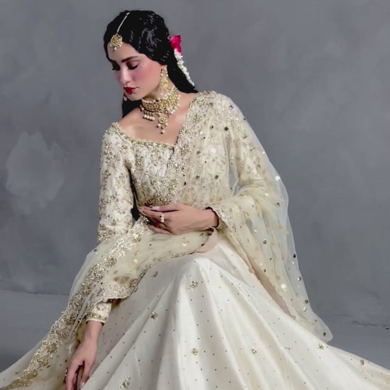 Ivory raw silk pishwas that feels like poetry in motion, its fitted bodice traced with delicate floral vine embroidery, like fine filigree against porcelain. The flare blooms outward, strewn with hand-placed boti motifs, each glinting softly under the light. The hem is crowned with a lavish embroidered border, anchoring the dreamy silhouette. A diaphanous mukesh net dupatta is scalloped, heavily worked, and dusted with sequins and it drapes like moonlight, completing this ode to quiet bridal grandeur.