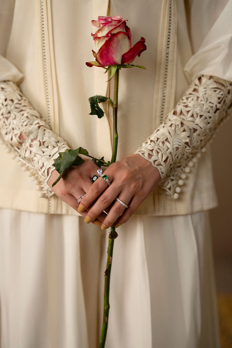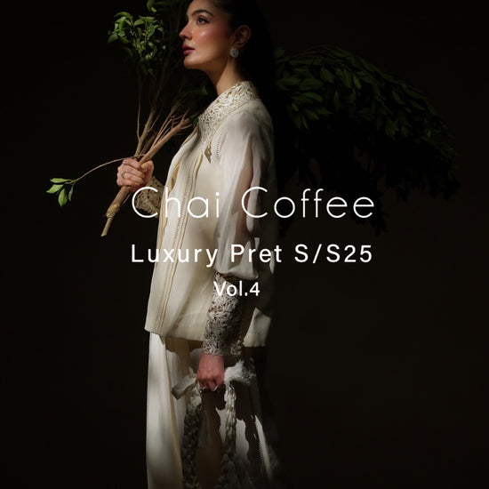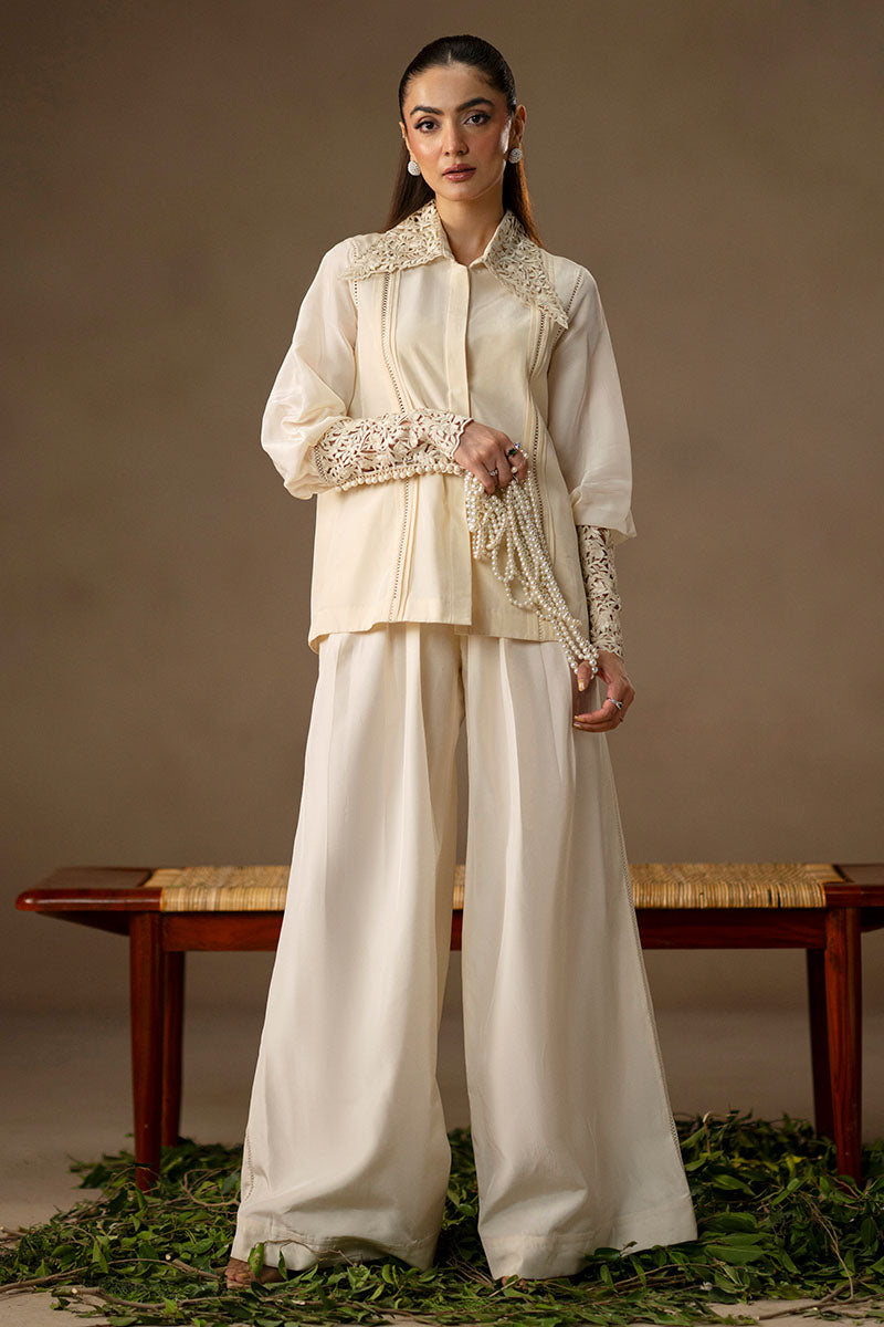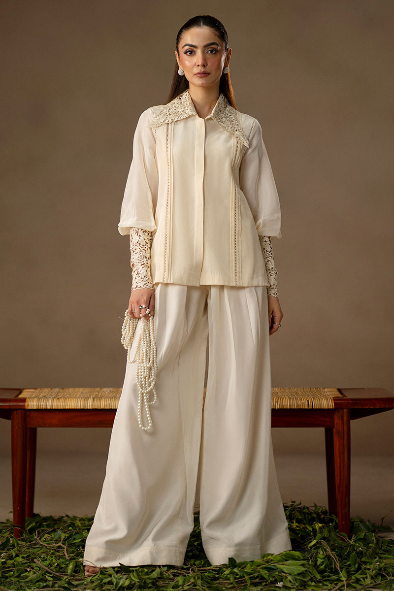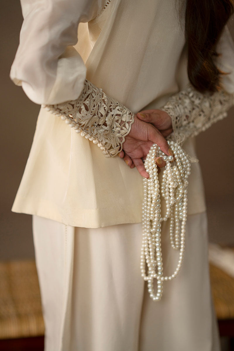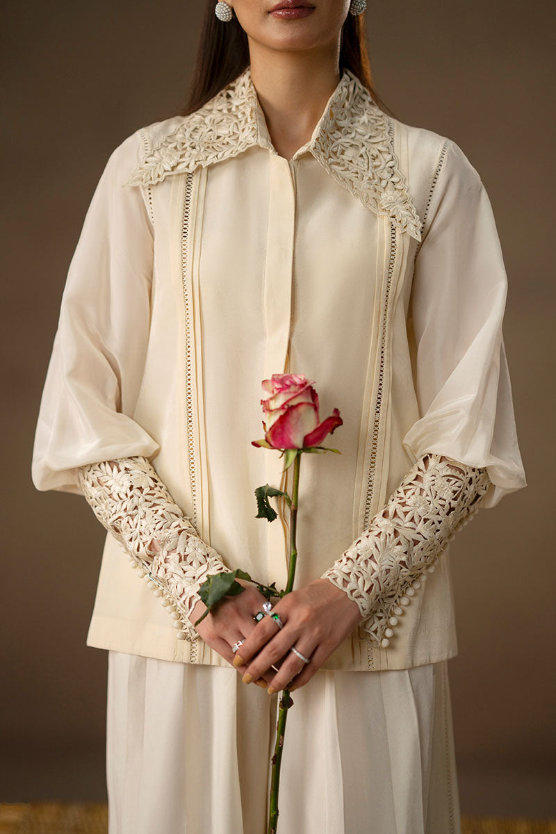 There’s something about off-white in daylight that feels like intention. The Lumira ensemble arrives in ramen silk with a lustrous pearl finish and a studied softness. The shirt’s exaggerated lace collar and cuffs are finished with toggle-loop closures, while pin tuck pleats run across the front in neat procession. The wide-legged trousers, cut from the same fabric glide just so, creating a silhouette that’s both prim and utterly relaxed. It’s ideal for those mornings that begin with breakfast and no particular end in sight.