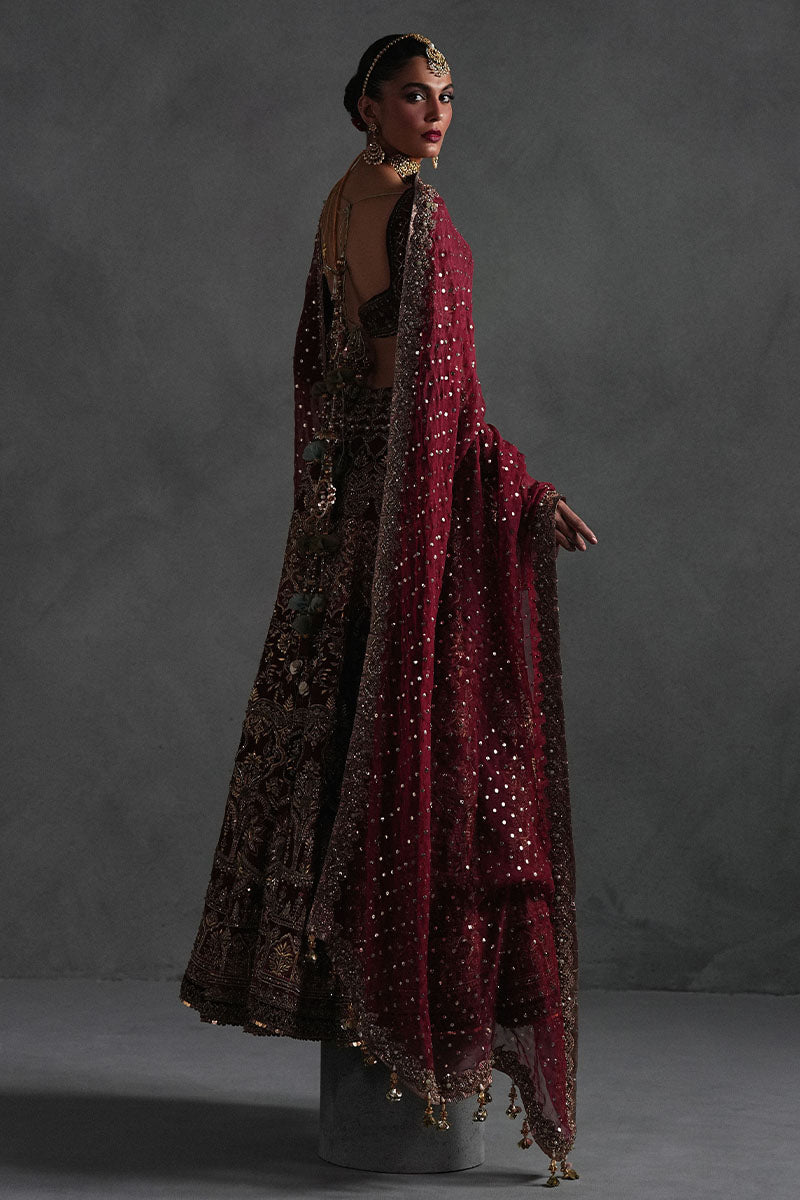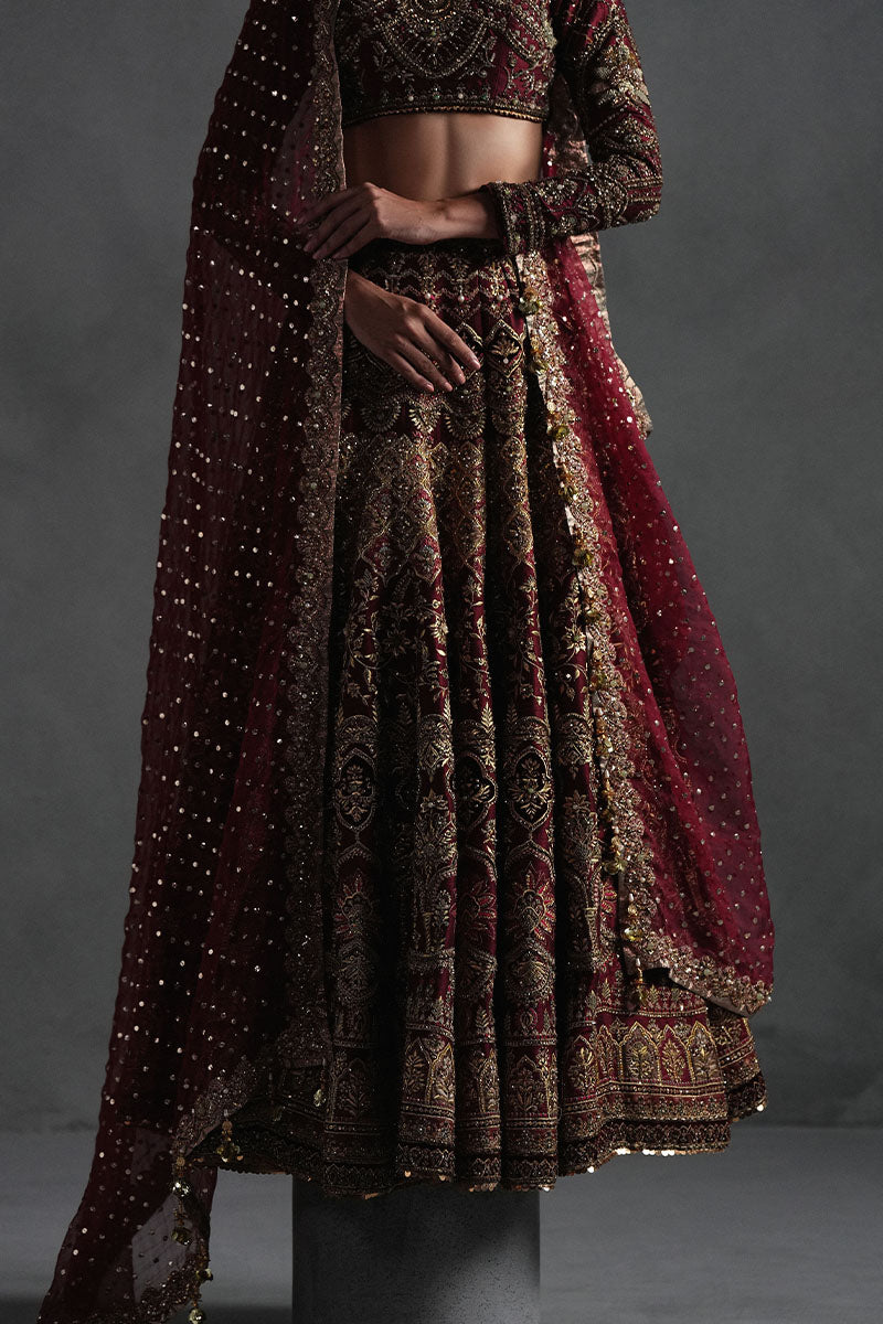 Deep Maroon indian silk lehnga and blouse. the blouse is solid hand embellishment and lehnga has multiple embroidery techniques, appliques used of tissue, velvet and is heavily embellished. Dupatta is maroon organza with mukesh spray and embellished border on 4 sided.