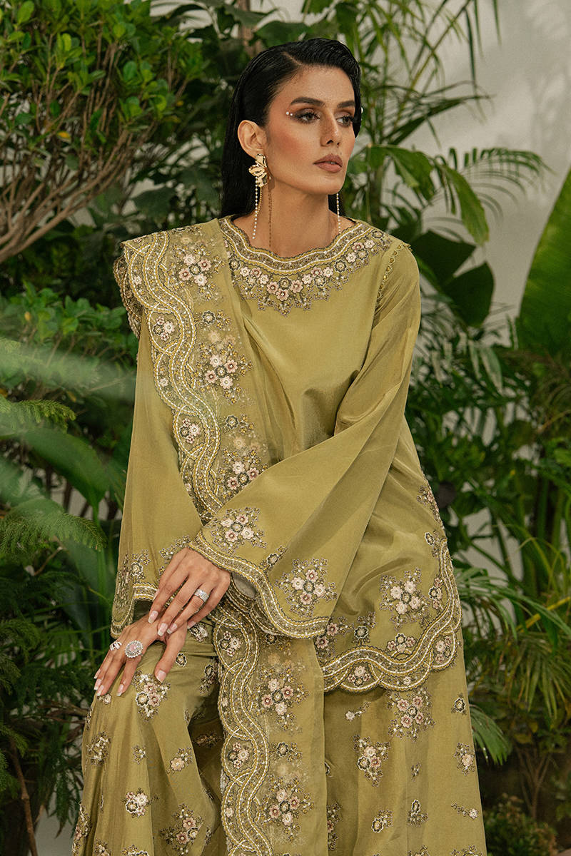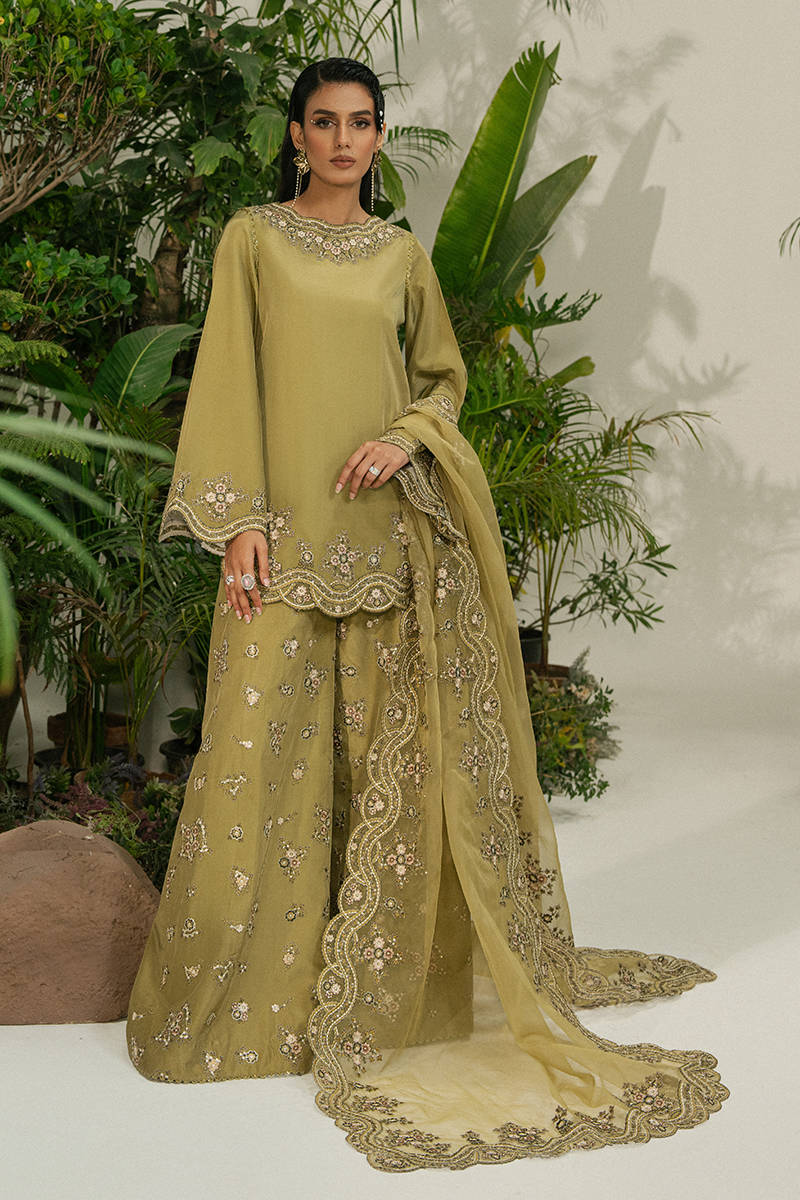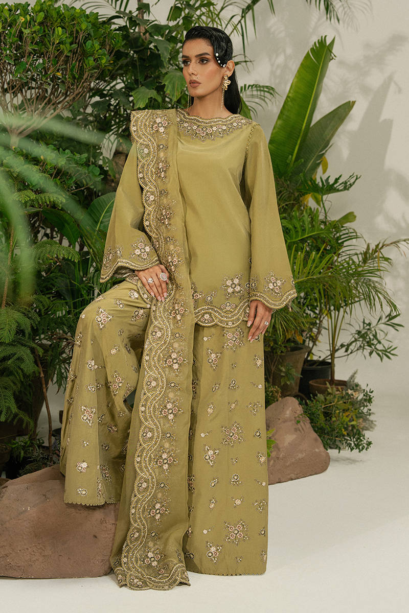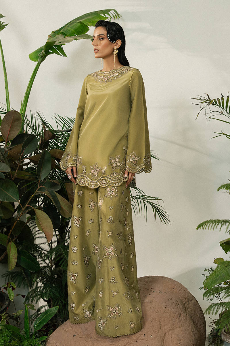 A raw silk shirt in deep olive green, embroidered with delicate floral bouquets and scalloped edges along the hem and sleeves, finished with fine trims. Paired with embroidered satin silk sharara pants, scattered with floral motifs for a soft, textured look. The organza dupatta, edged with a four-sided embroidered scalloped border, adds an airy finish. Effortless, polished, and easy to wear.