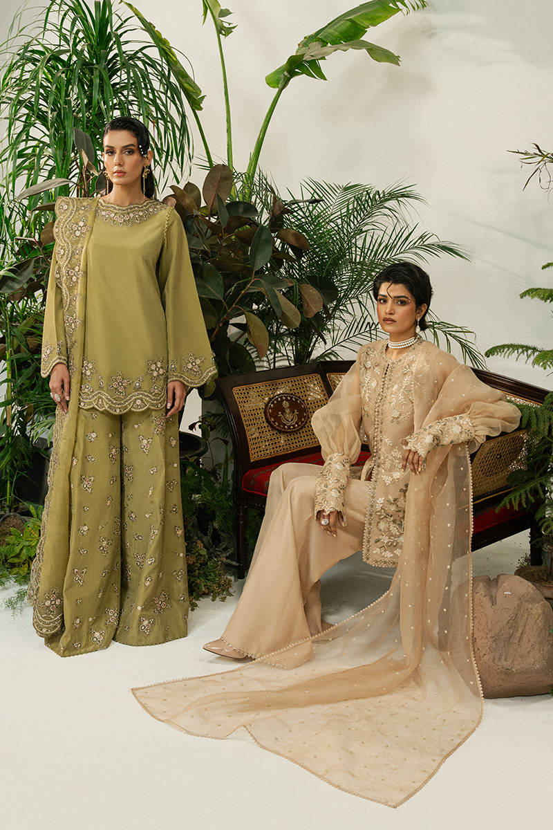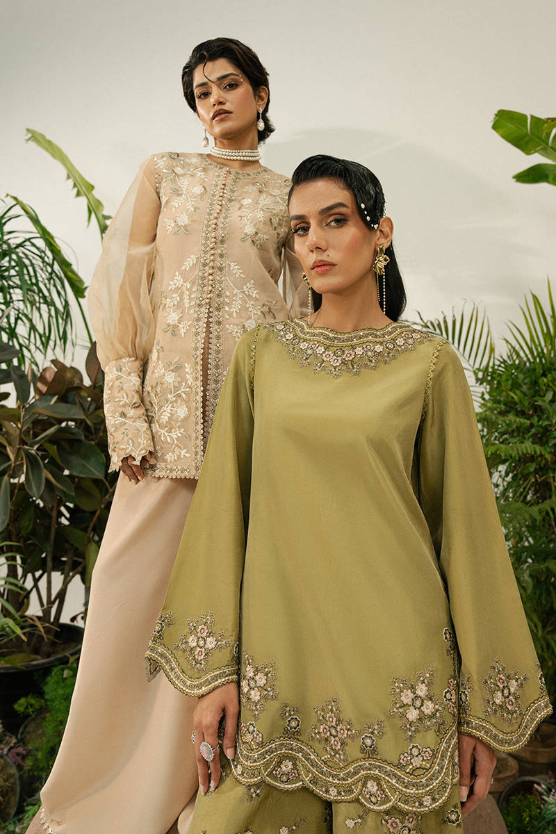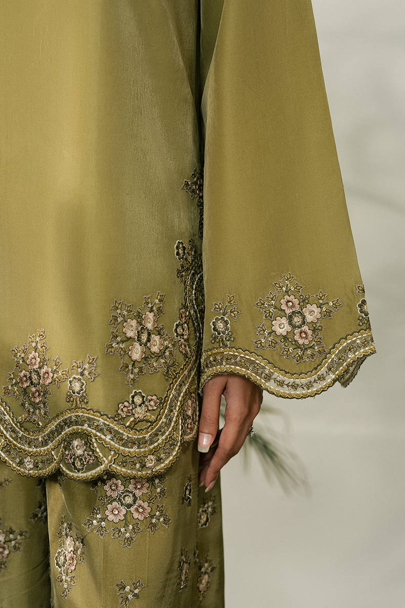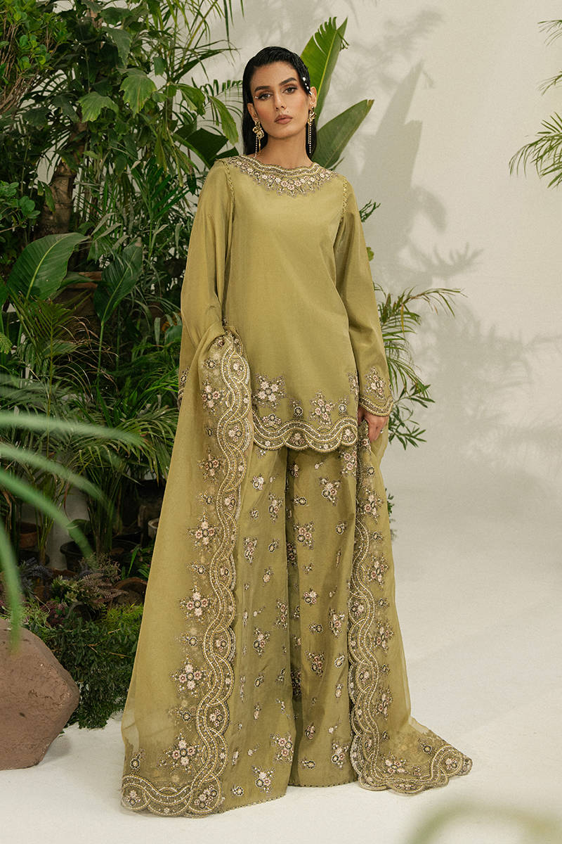 A raw silk shirt in deep olive green, embroidered with delicate floral bouquets and scalloped edges along the hem and sleeves, finished with fine trims. Paired with embroidered satin silk sharara pants, scattered with floral motifs for a soft, textured look. The organza dupatta, edged with a four-sided embroidered scalloped border, adds an airy finish. Effortless, polished, and easy to wear.