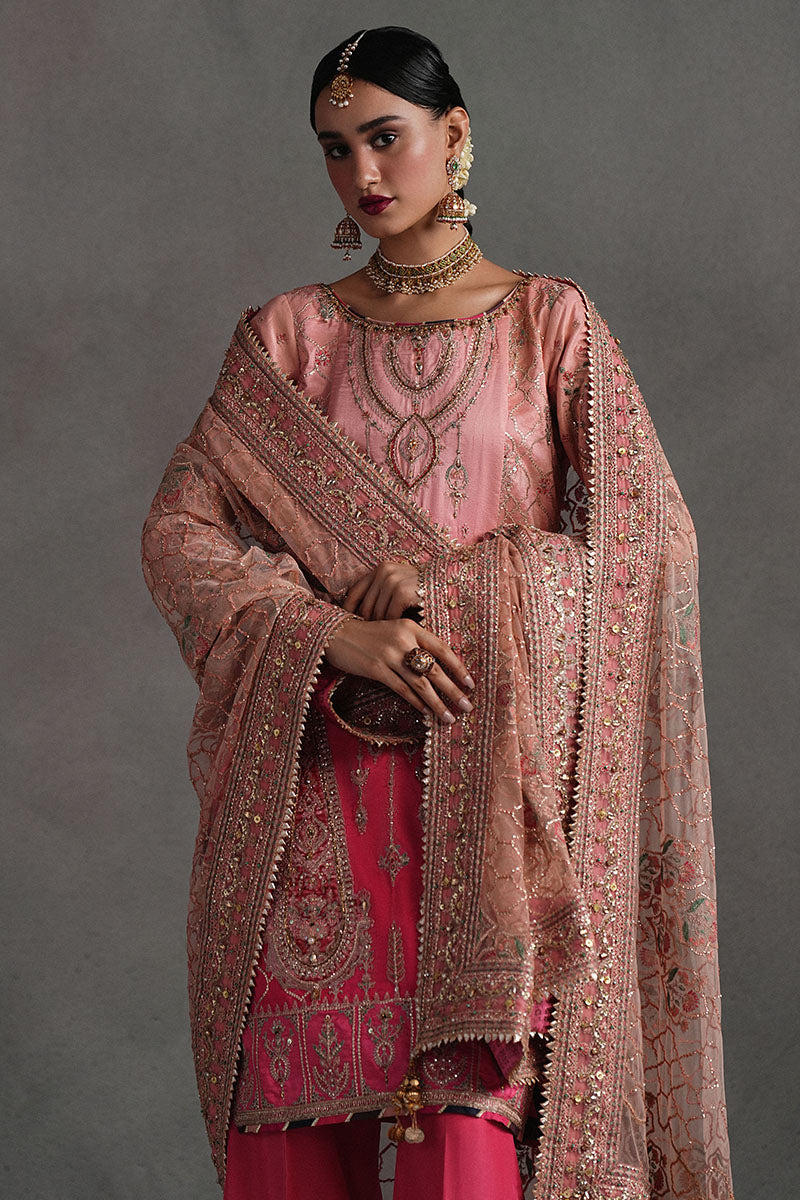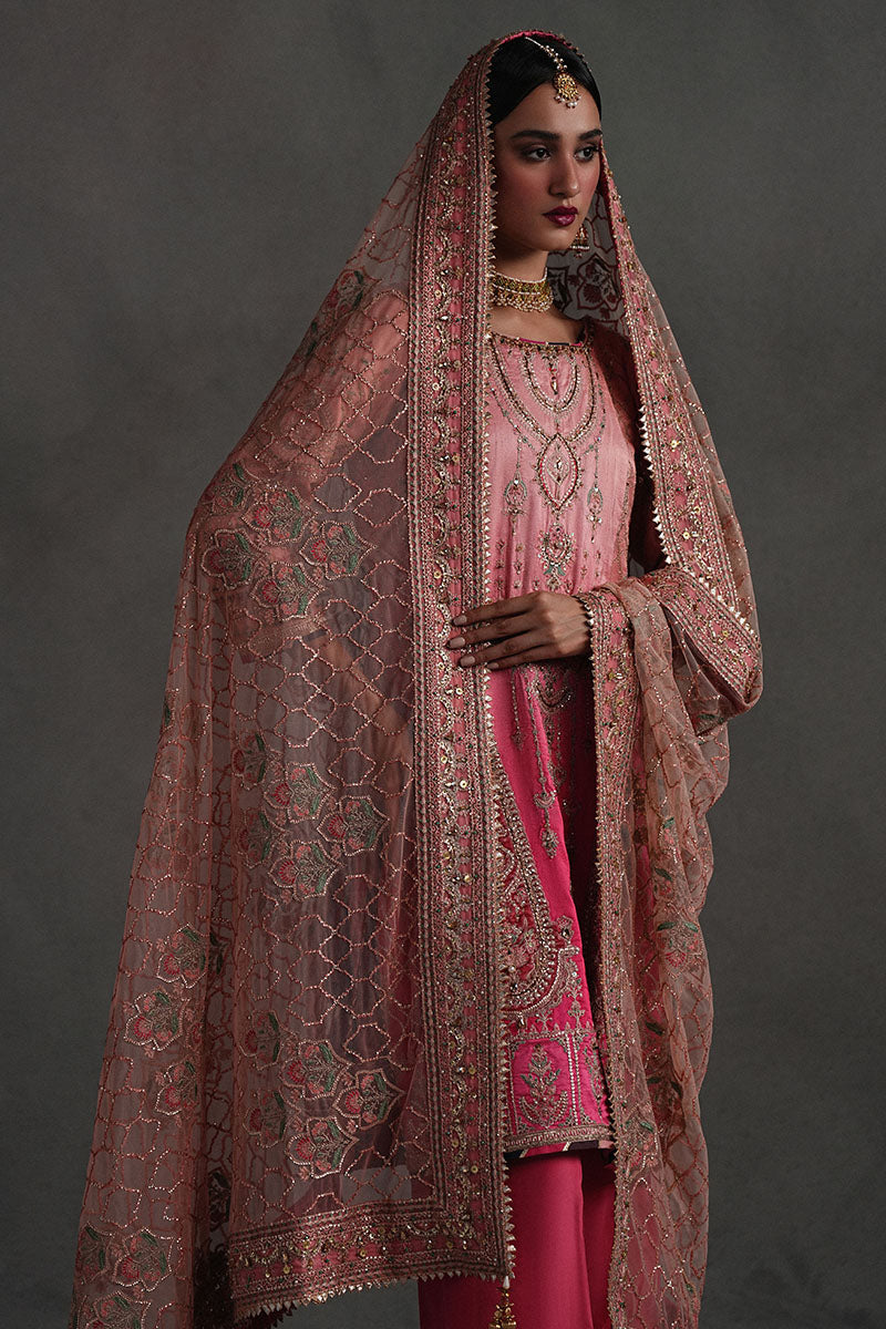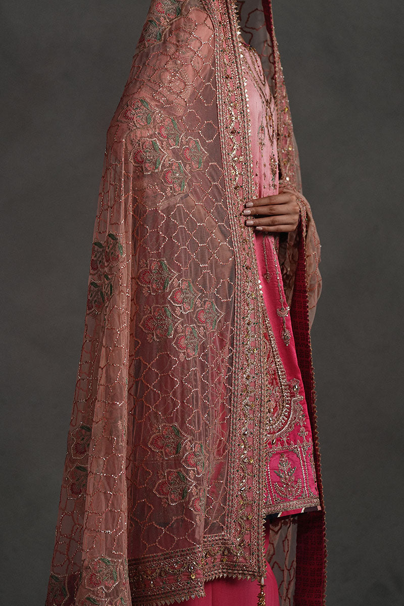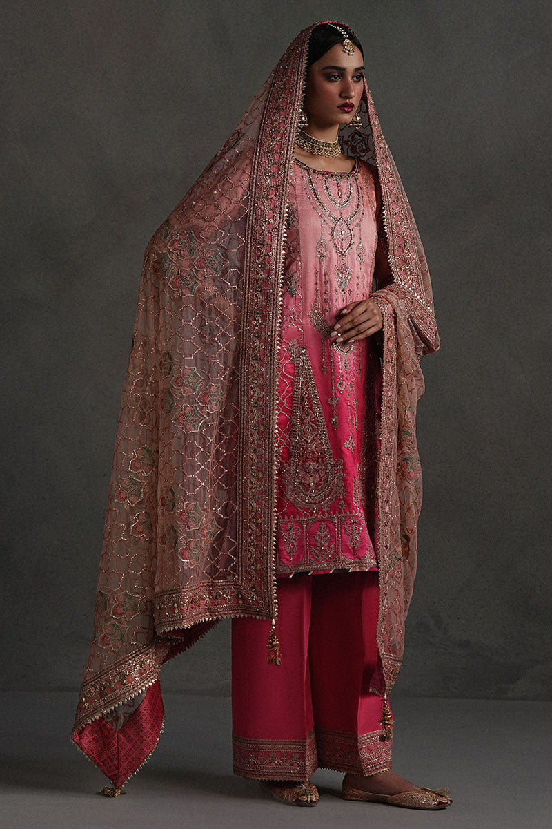 A rawsilk embroidered shirt with hand embellishments and izaar pants with straight heavily embroidered multihead border and net dupatta with sequins