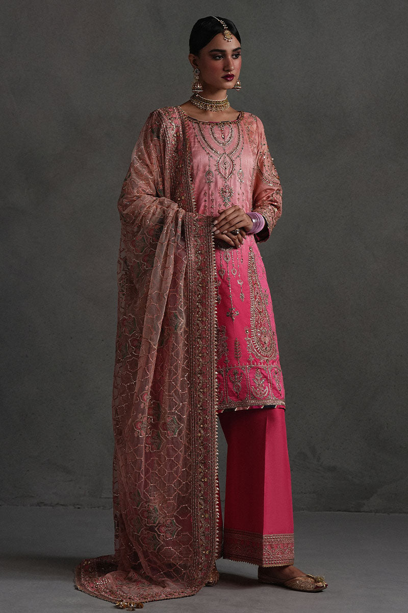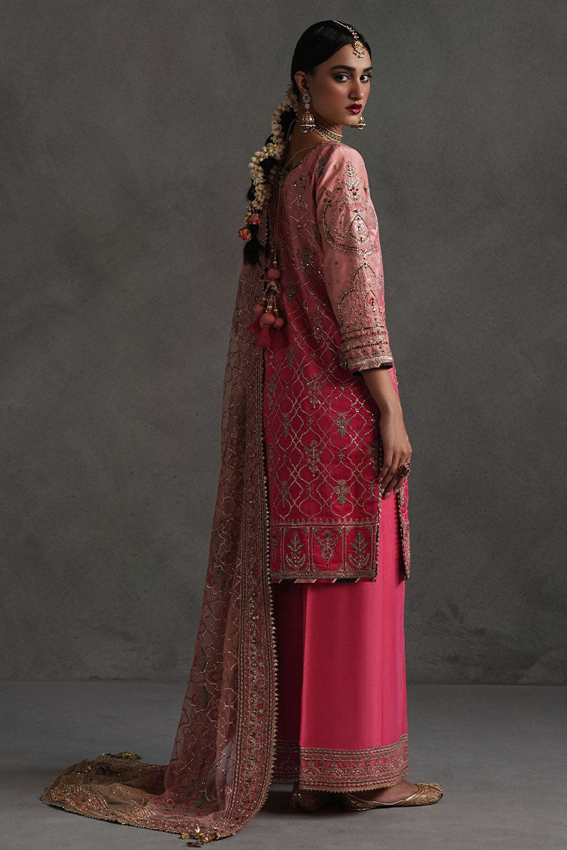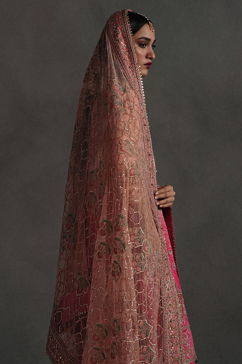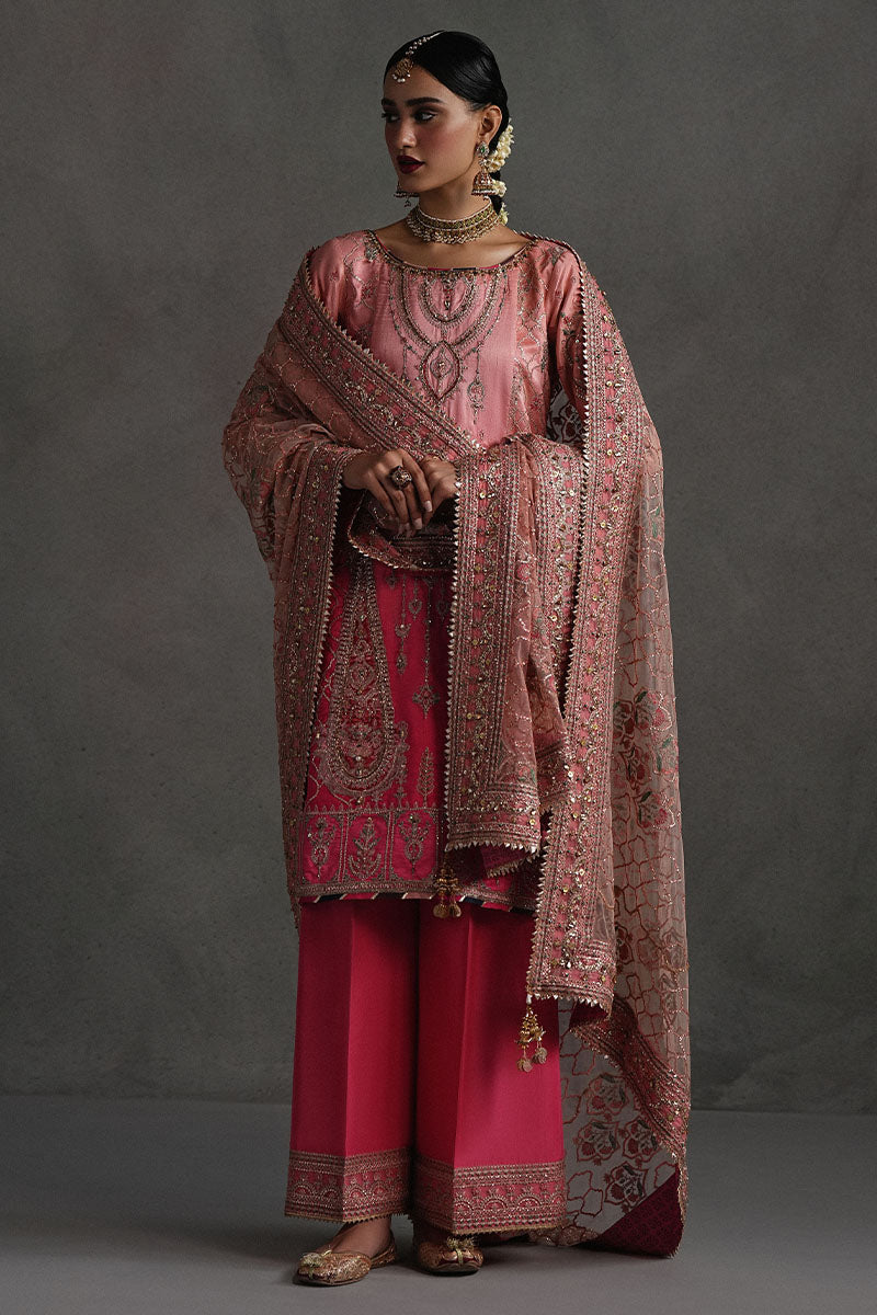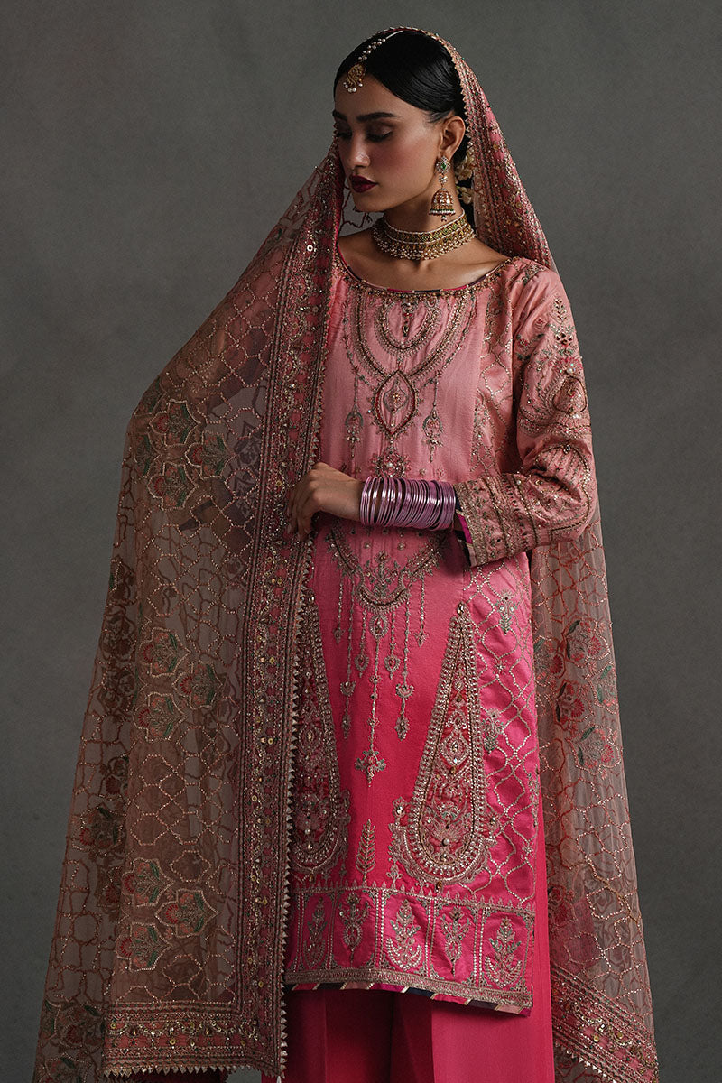 A rawsilk embroidered shirt with hand embellishments and izaar pants with straight heavily embroidered multihead border and net dupatta with sequins
