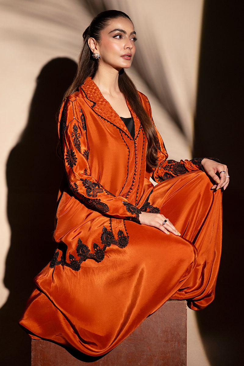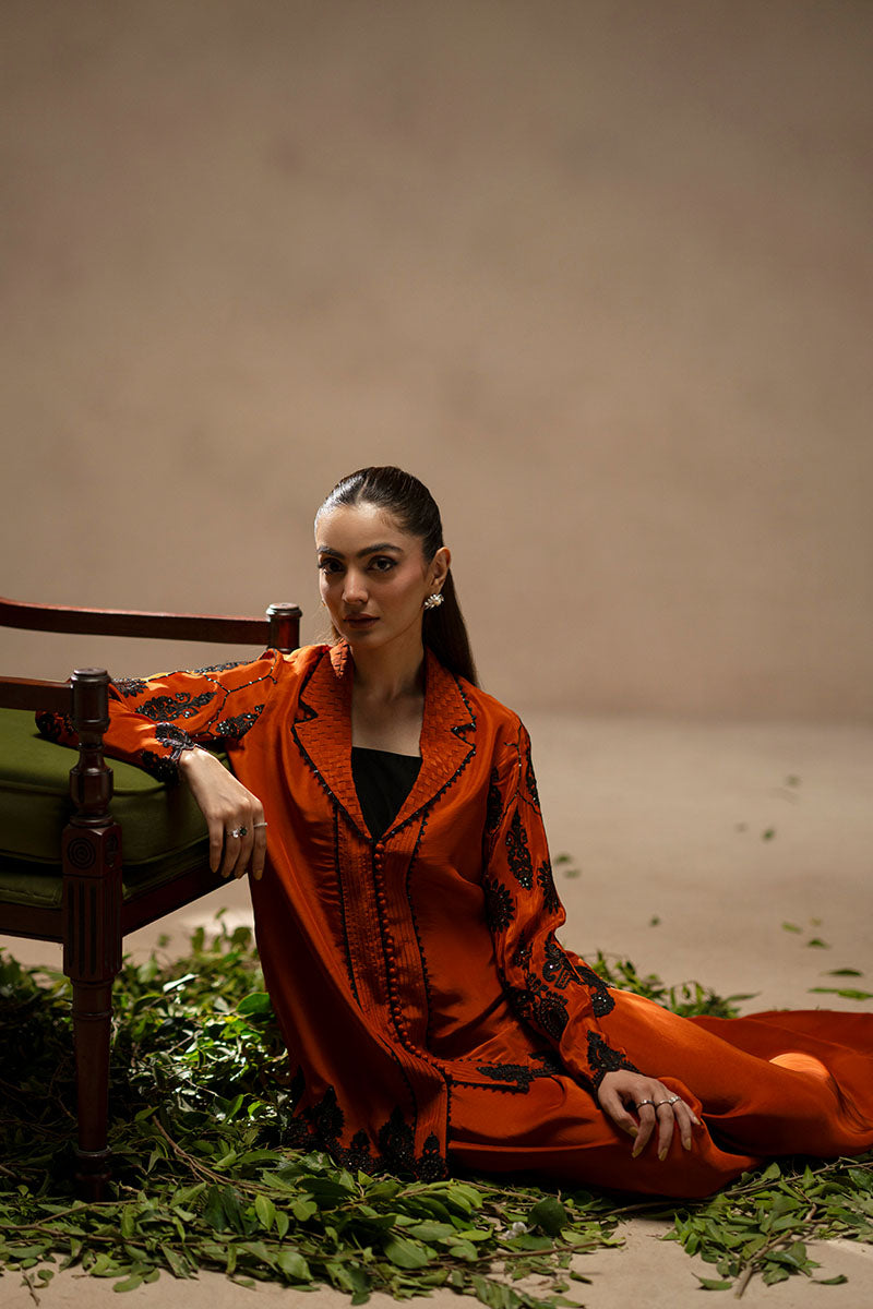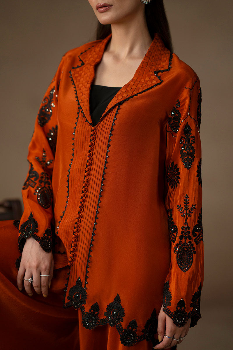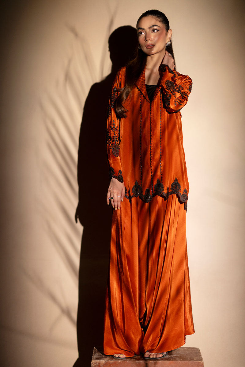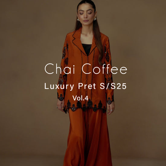 For those who treat coffee runs like fashion moments. When the plan is casual but the mood calls for impact, the Orange ensemble makes the statement. The shacked—half-shirt, half-jacket—is cut in juicy orange and features a woven, revere-style collar stitched into a grid of textured fabric, trimmed in black thread. Black lace appliqués and glittering sequins curl around the sleeves and hem, while pin tucks and loop buttons offer sharp finishing’s. The wide-legged trousers match in tone and ease. An ensemble for when you’re dressing up like you’ve got plans, even if you don’t.