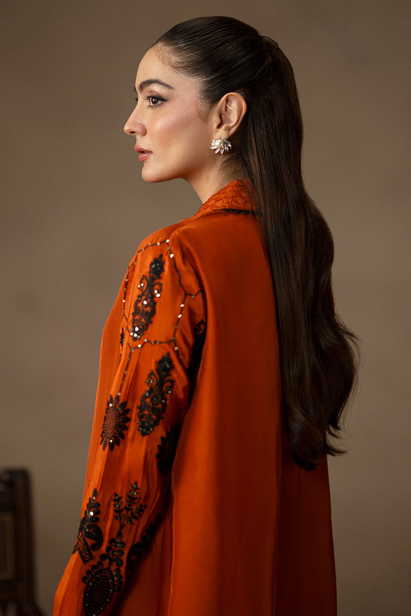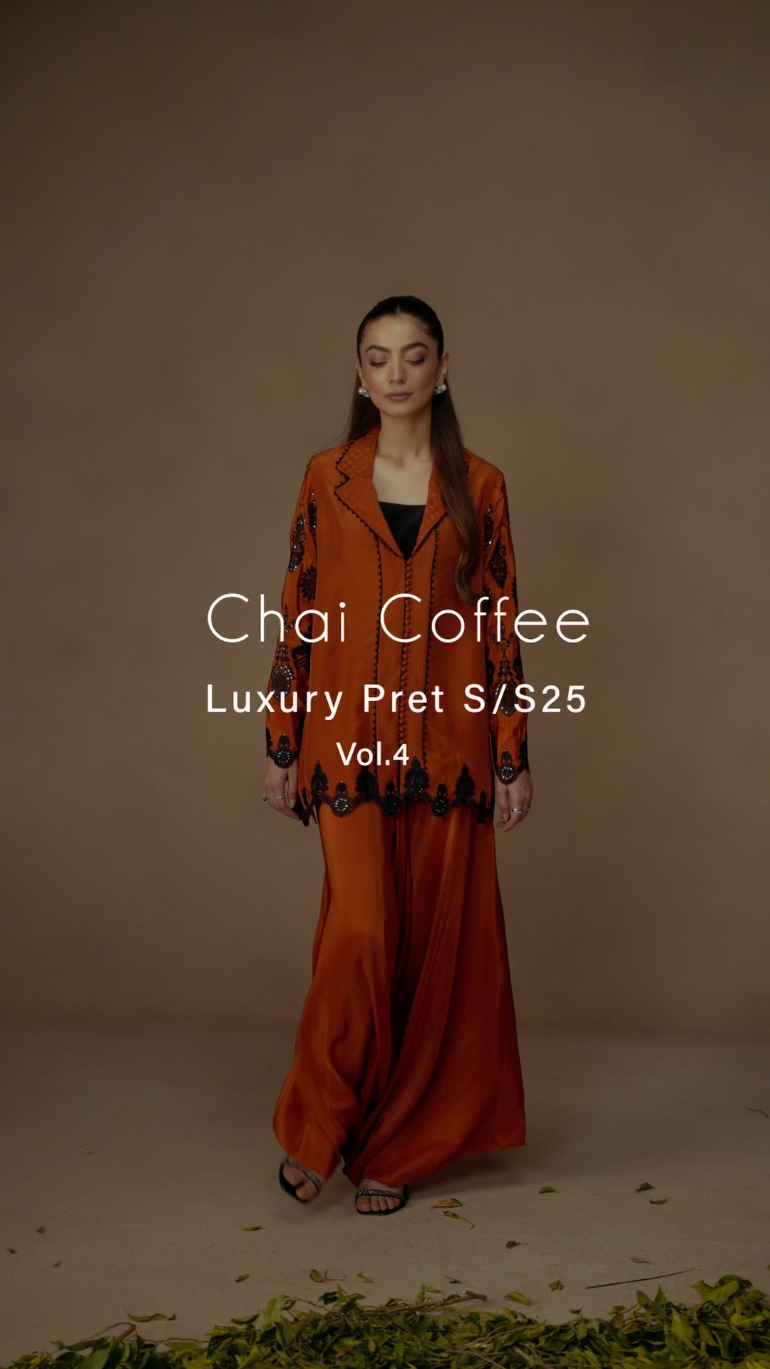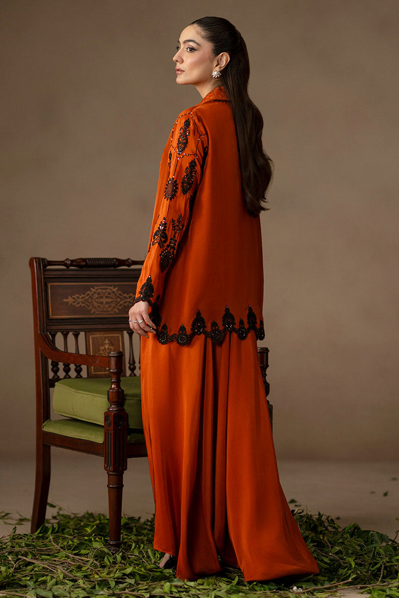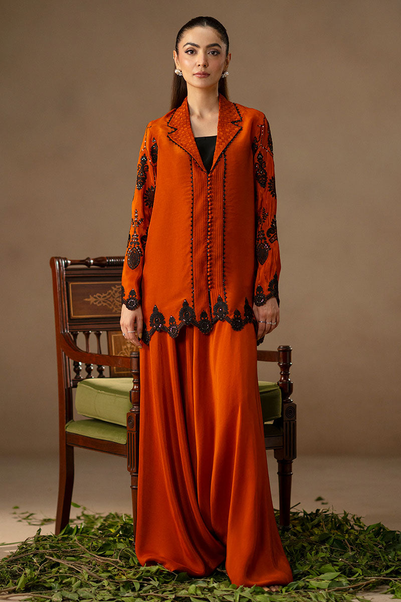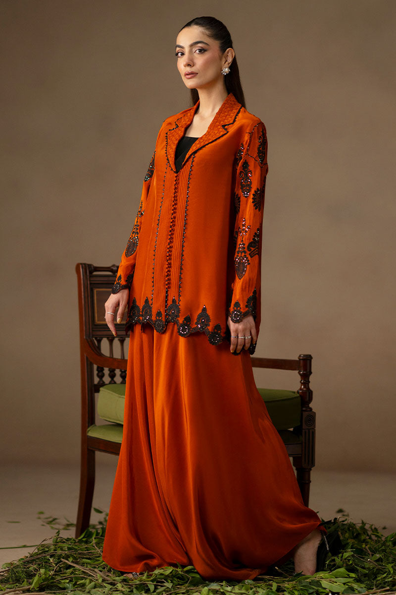For those who treat coffee runs like fashion moments. When the plan is casual but the mood calls for impact, the Orange ensemble makes the statement. The shacked—half-shirt, half-jacket—is cut in juicy orange and features a woven, revere-style collar stitched into a grid of textured fabric, trimmed in black thread. Black lace appliqués and glittering sequins curl around the sleeves and hem, while pin tucks and loop buttons offer sharp finishing’s. The wide-legged trousers match in tone and ease. An ensemble for when you’re dressing up like you’ve got plans, even if you don’t.