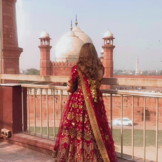 A stunning red lehnga choli meticulously adorned with shimmering sequin work and intricate adda embroidery, exuding timeless charm and grandeur. The look is complemented with an ethereal organza dupatta, delicately embellished with chan sequins and a beautifully finished border, creating a perfect harmony of tradition and elegance.