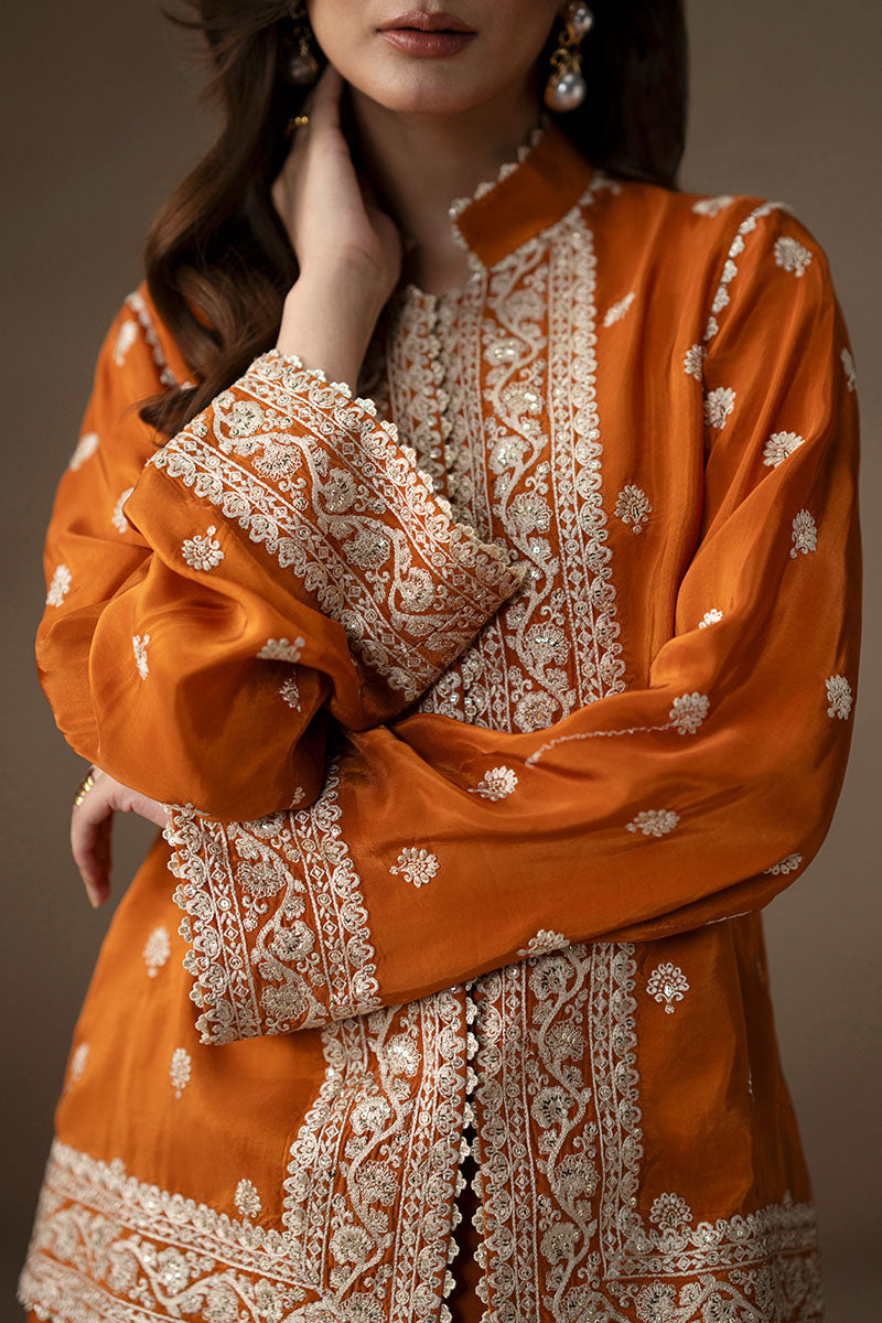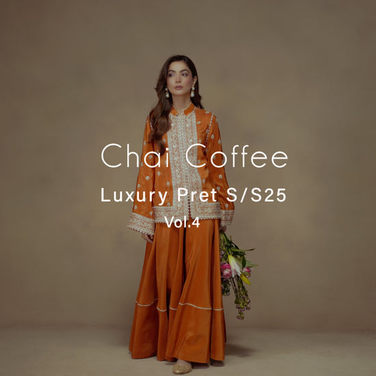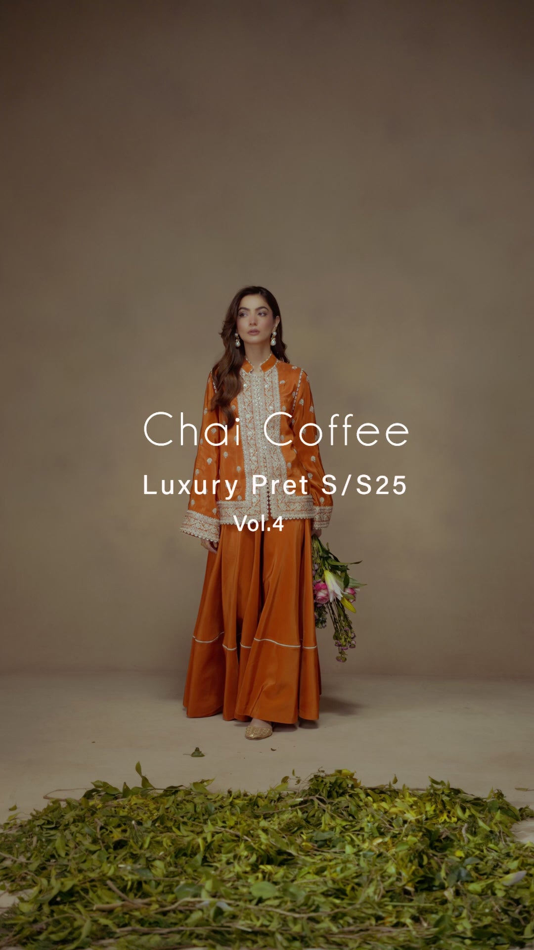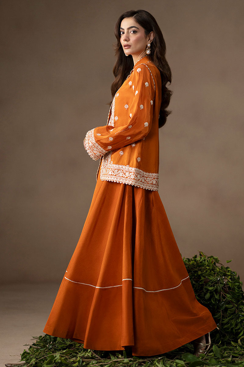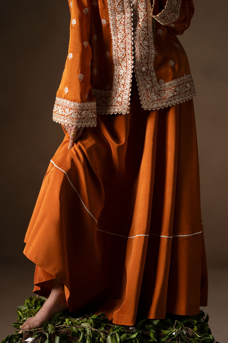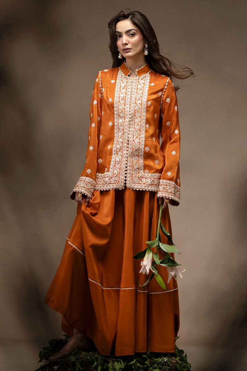 For the days when plans that start with chai and end somewhere fabulous, the Rusha ensemble offers a composed yet breezy silhouette in deep rust. The top, tailored like a softly structured Mao jacket, features intricate white threadwork that runs across the sleeves and front panel with a quiet exactness. A band collar and narrow embroidered borders frame the piece with restraint, while the floor-length skirt flares out gently, its hem echoing the same white embroidery. Together, they make a compelling case for dressing up without ever having to say so.