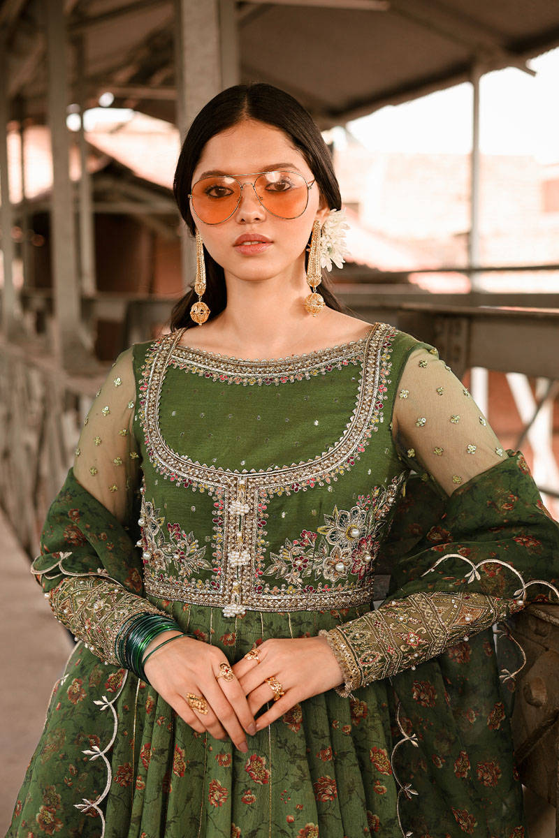"Sairah" a green printed paper silk Piihwas adorned with red and yellow floral vines. The bust line boasts an Anarkali-like choli pattern with mukesh embellishments and tila work in complementary colors. Appliques, enhanced with adda work and sequins on the sleeves and hem of the skirt, are finished with beautiful trims. The ensemble is elegantly complemented by a printed organza dupatta featuring a scalloped edge and embroidery on all four sides, blooming motifs on the corners. Paired with a Choori Daar pajama made of Russian fabric and adorned with gota kinari celebrating the timeless elegance of Eid