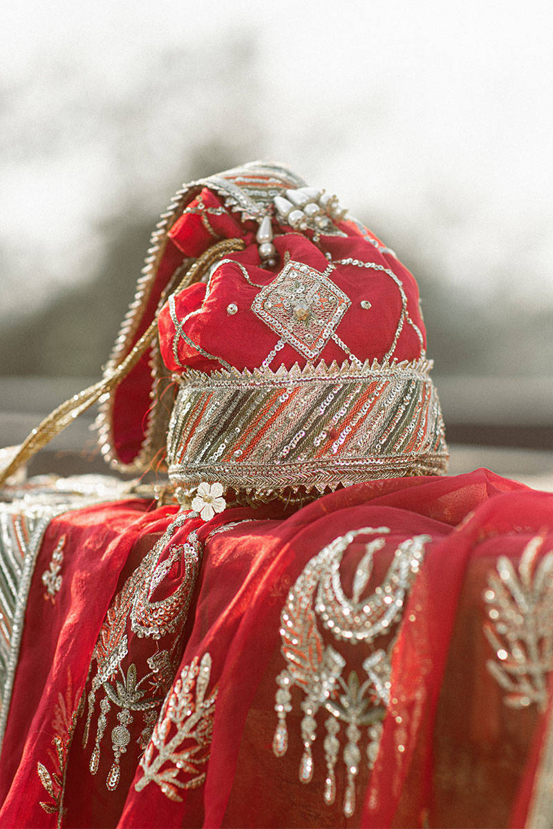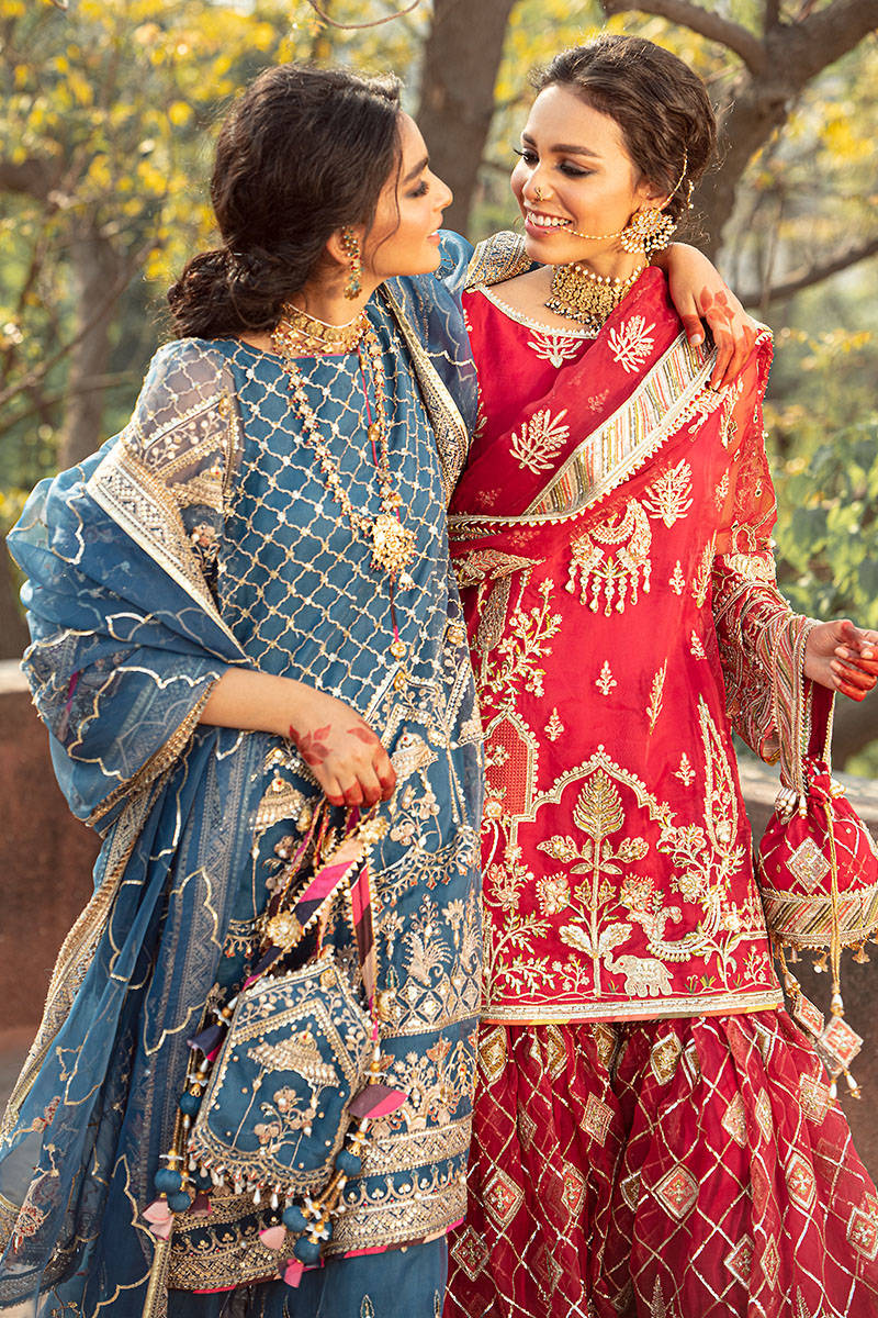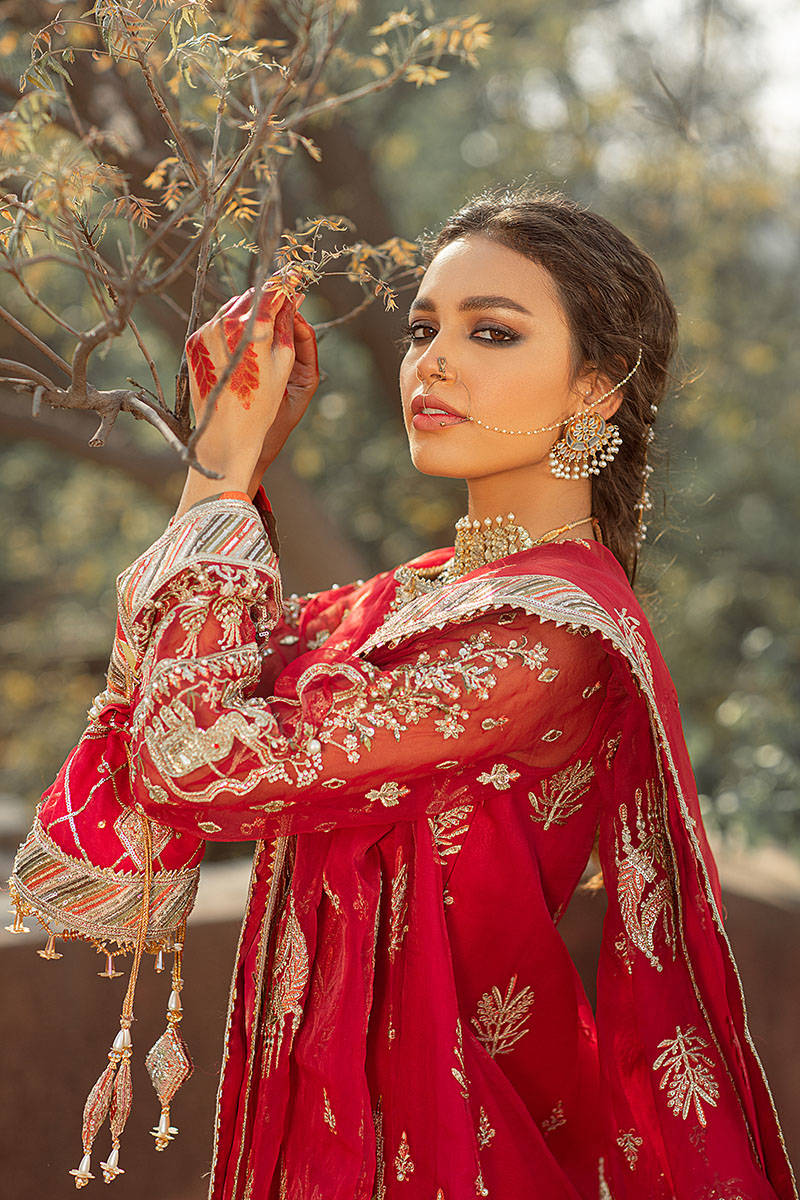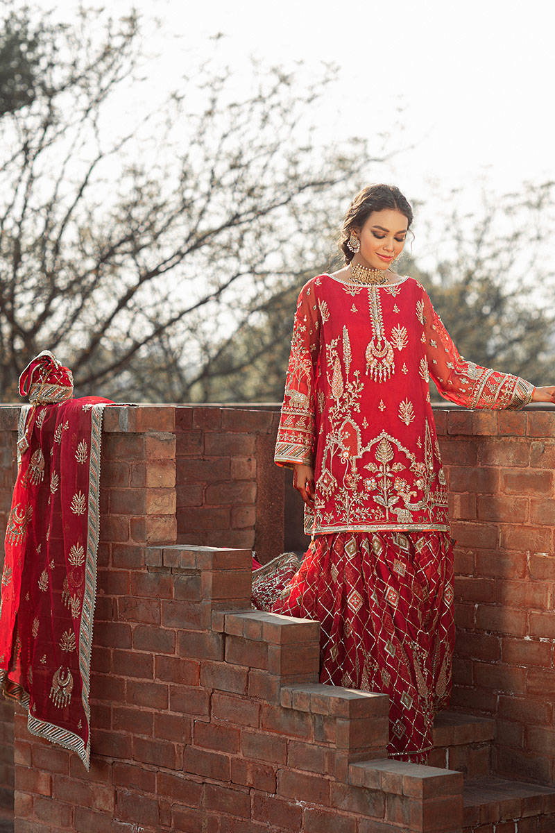 Erica wears Singhaar. A bright red organza gharara set accented with luxe gold embroideries. With illustrious apray of oriental motifs spread through out the length of the shirt and dupatta. The look is balanced off with our signsture gharara sporting a classic jaal with patch work motifs. The set is finished with generous gota edges with chattapatti in contrasting colors."