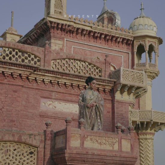 Indulge in the enchanting allure of the 'Talia' ensemble, a masterpiece that exudes elegance in a mauve shade with a hint of enchanting purple-grey undertones. Crafted from exquisite tissue fabric, the ensemble features intricate tilla embroidery, along with allover embellishments and mirror work that create a breathtaking symphony of opulence. Paired with an organza embroidered dupatta, also adorned with rich embroidery and a striking border, 'Talia' is the epitome of grace. Even the trouser boasts embroidery around the hem, adding a touch of finesse to this mesmerizing creation. 'Talia' is a celebration of refined beauty and craftsmanship, making it a perfect choice for brides who seek an extraordinary and unforgettable look
