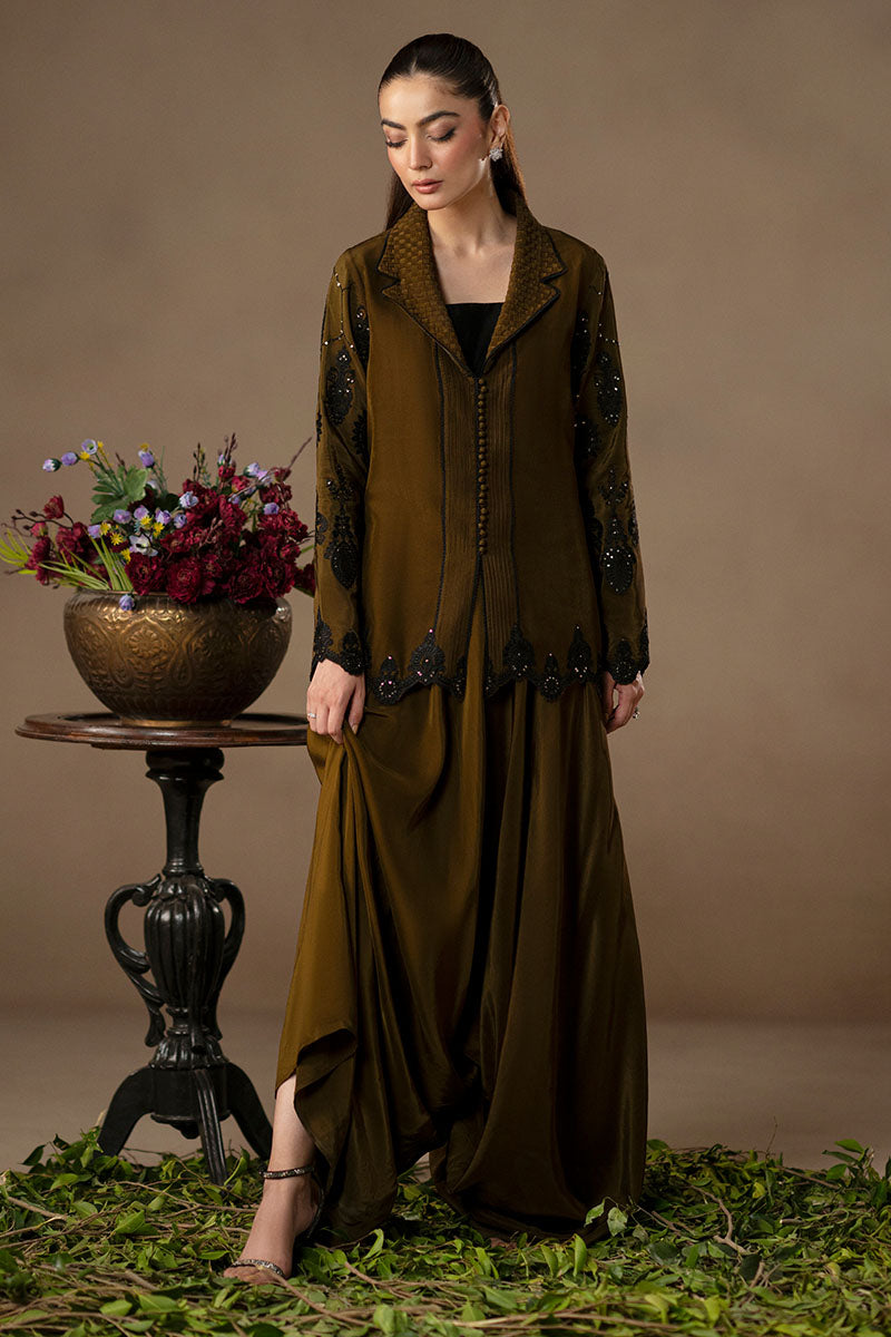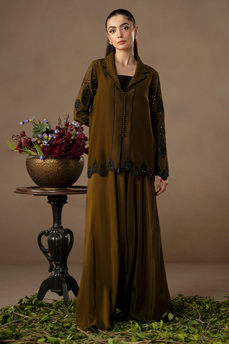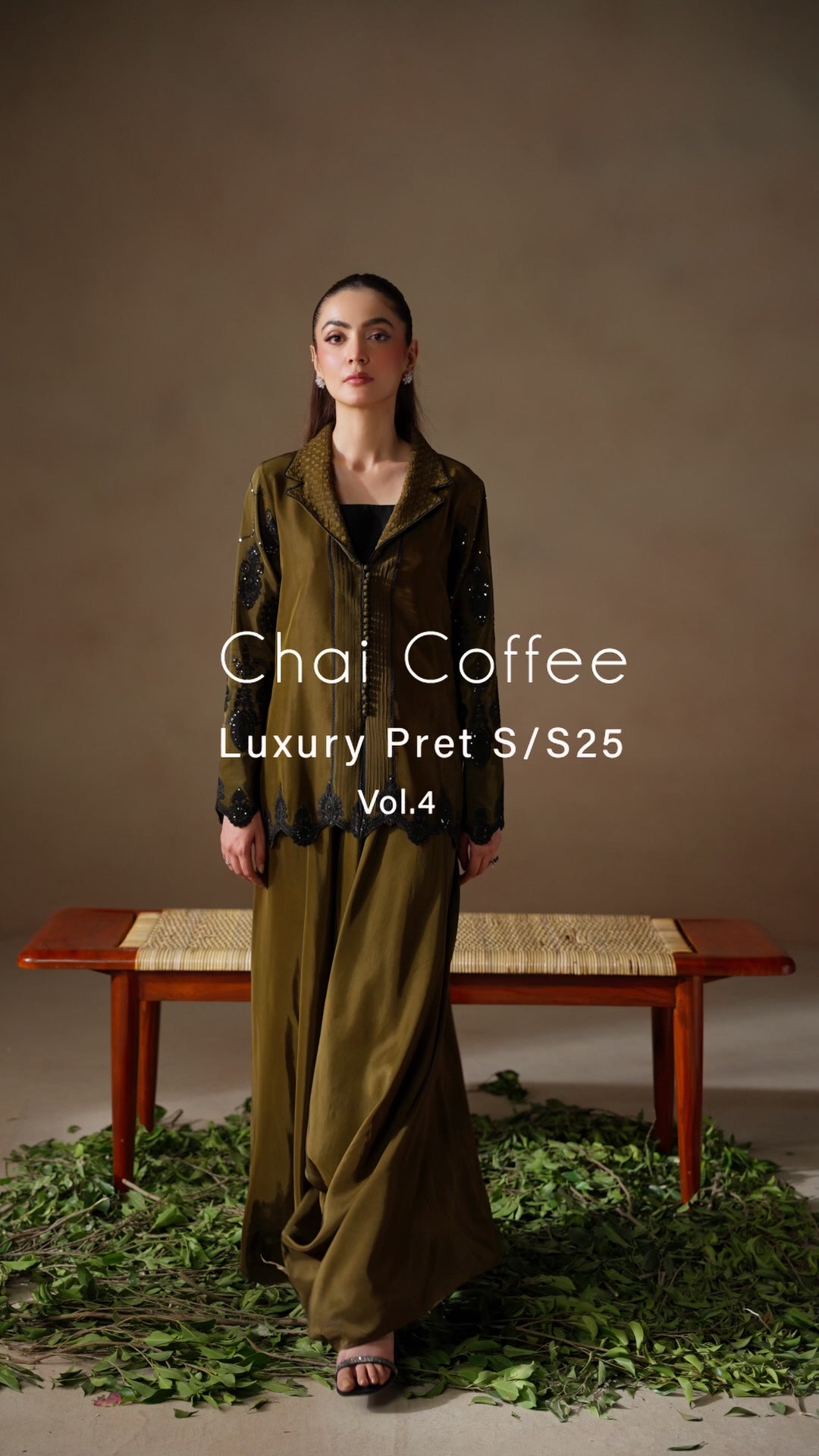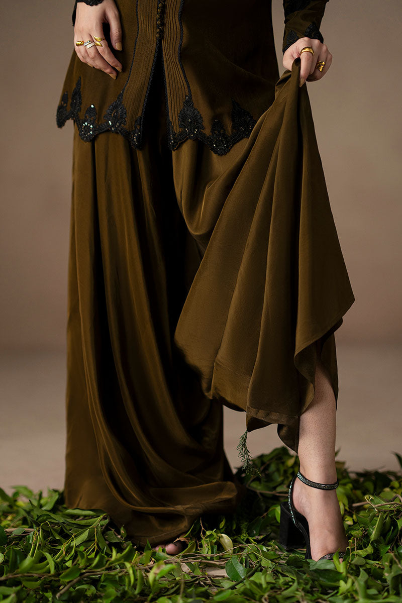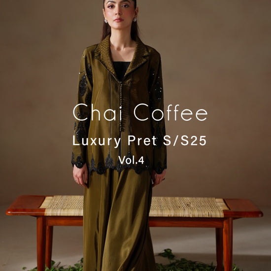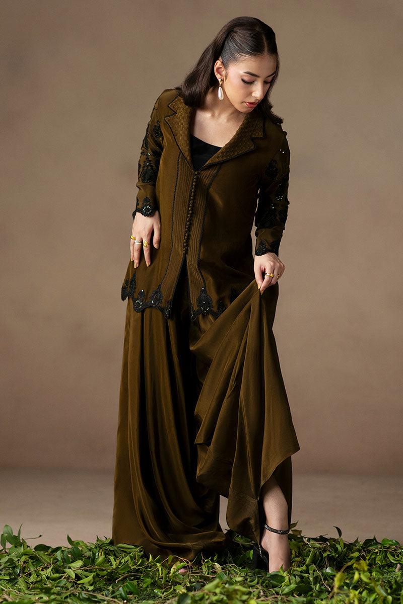 Tailored for chai, built for showing up. For those who prefer their tea plans with a side of edge, the Tiva ensemble serves up just the right mix of structure and fluidity. In a deep moss green, the jacket features a standout lapel, woven in basket weave-like effect and outlined in black thread that leads the eye straight into the details. Embroidery traces the sleeves and hem, while the front fastens neatly with loop buttons. Paired with matching flared trousers, this look is all presence without ever raising its voice.