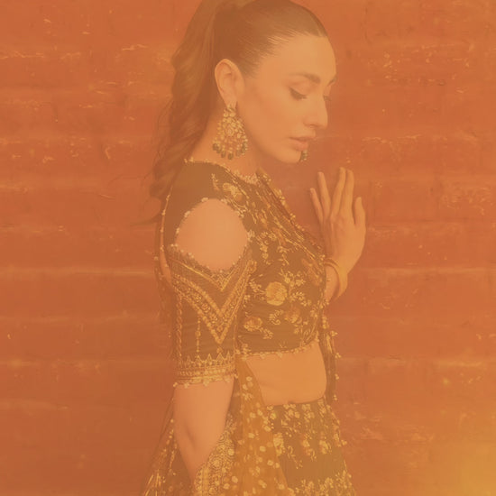 Crafted from luxurious Indian silk, this exquisite ensemble showcases intricate patchwork adorned with delicate sequins, pani, and tilla embroidery. The artistry reflects timeless craftsmanship and refined elegance. Paired with a beautifully scalloped border dupatta, this creation exudes regal allure and graceful sophistication — a true statement of opulence and tradition.