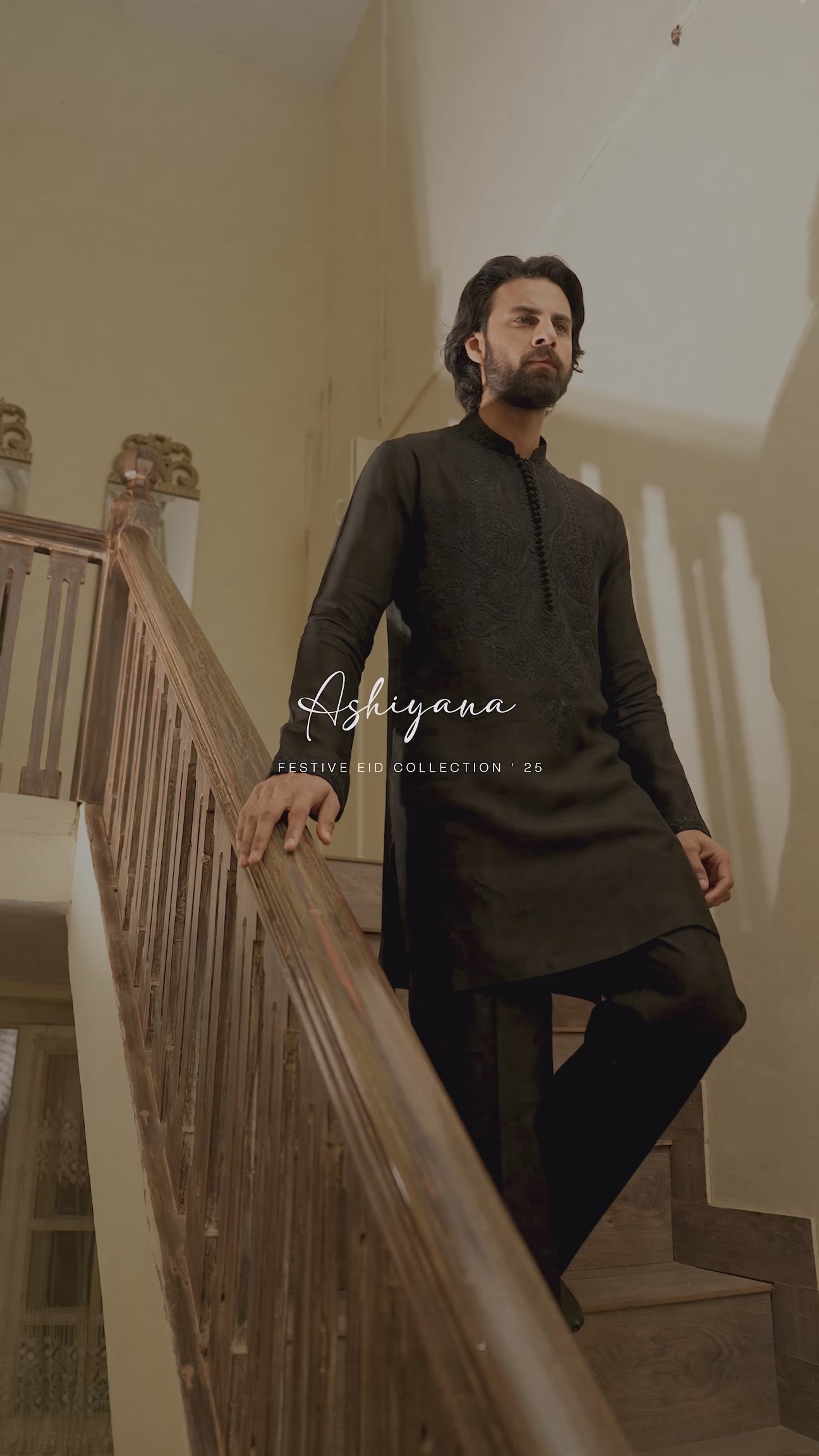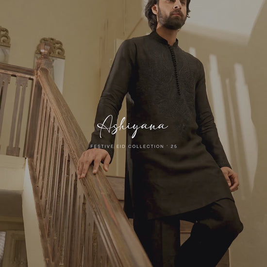 A short self-cotton kurta and trousers in Midnight Black with tonal black anchor and Resham embroidery across the chest. The loop-button band collar neckline and embroidered sleeve borders offer a structured, modern finish. An ideal pick for Eid evenings—whether stepping out for a festive dinner or enjoying the night breeze on a rooftop gathering.