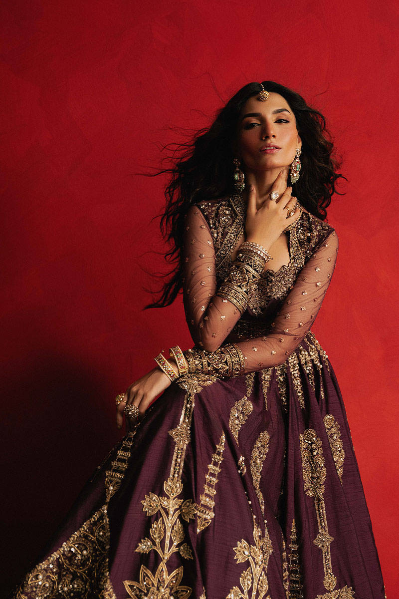 Named after the fierce poet-princess, Zeb-un-Nissa is rendered in royal purple Indian silk, this ensemble is saturated with opulence: silk appliqués, block print, adda embroidery, and mirror shimmer. The choli has full sheer sleeves that are dusted with golden motifs and framed with layered decorative borders in embroidery, sequins, and beads. Its neckline is traced with gold floral vines that curl like verses from a ghazal. The lehenga begins with persian boteh motif, then transitions into slender cypress trees, before bursting into a symphony of circular vines and paisley patterns all block printed in gold and embroidered by hand with sequins, mirror work, and metallic threads. The hemline is wrapped in multiple embroidered borders layered with gota patti and finishing trims. The organza dupatta is no less regal, featuring decorative roundels and Mughal jaali-inspired motifs, edged with thick gold borders and beaded tassels that flirt with the wind